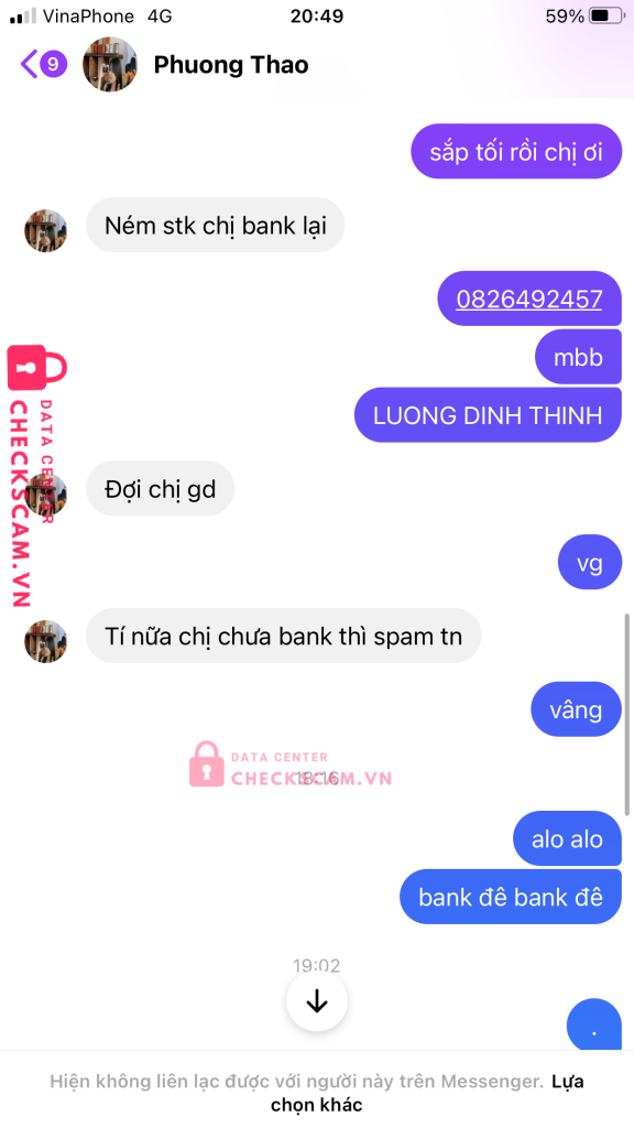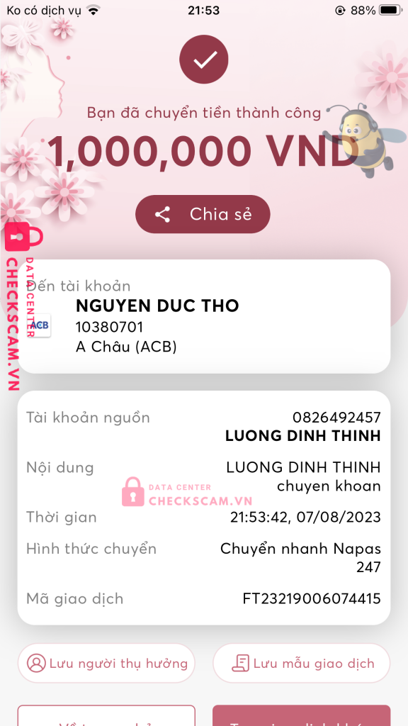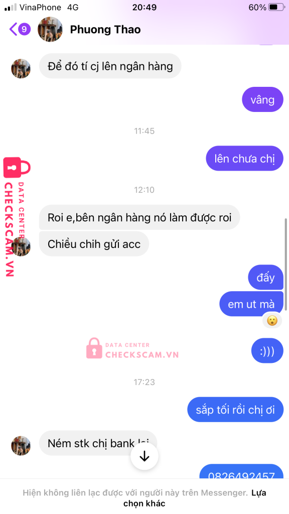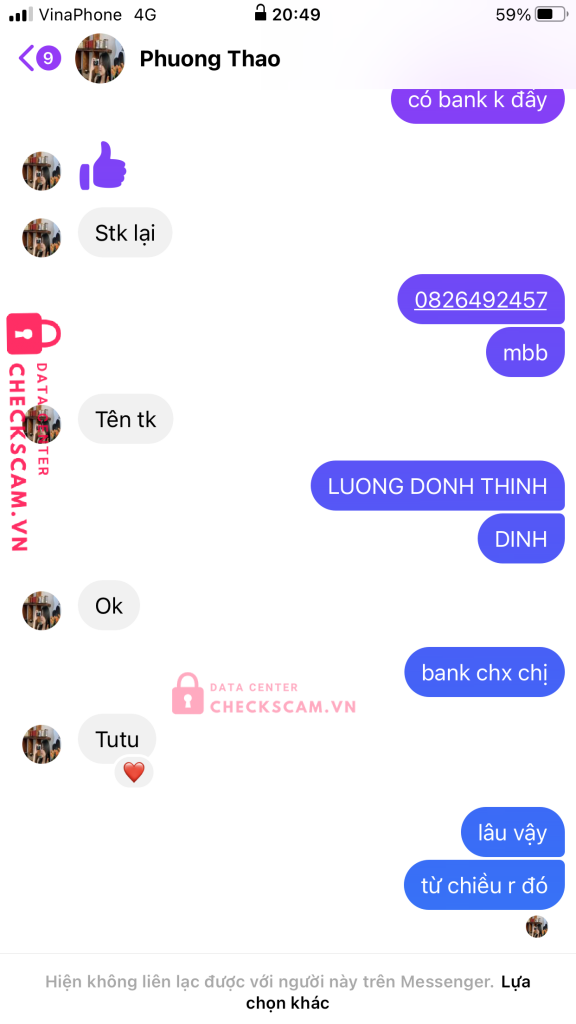 Scammer Alert: Nguyễn Đức Thọ Reported: November 16, 2024 Scammer Information Full Name: Nguyễn Đức Thọ Phone Number: 0332980242 Payment Gate: ACB Payment Account: 10380701 Category: Marketplace scams Source: Checkscam Evidence Files Report Description lừa đảo chuyển tiền xong block Comments Your comment Add Comment No comments yet. Be the first to share your experience with this scammer.