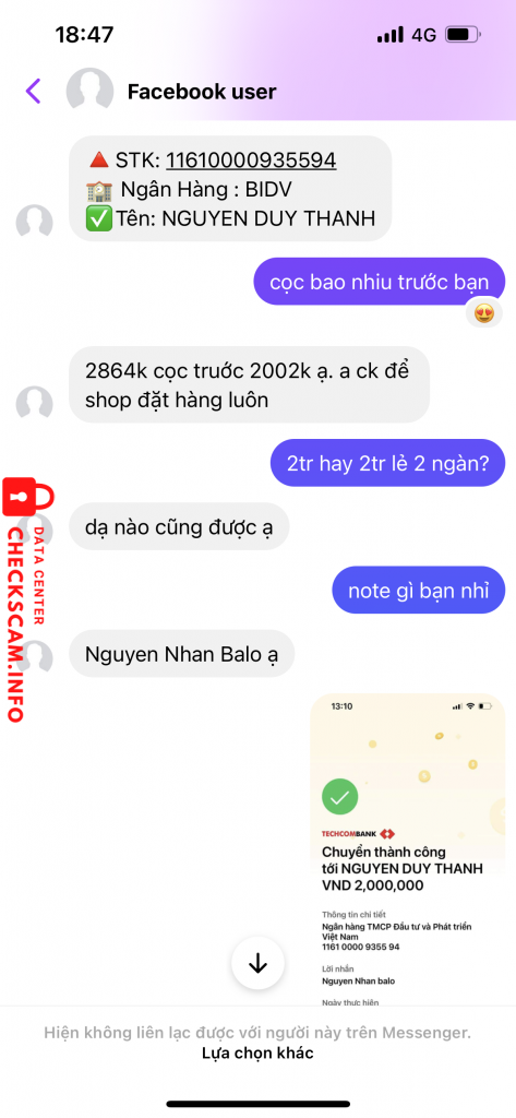 Scammer Alert: NGUYEN DUY THANH Reported: November 16, 2024 Scammer Information Full Name: NGUYEN DUY THANH Payment Gate: bidv Payment Account: 11610000935594 Category: Marketplace scams Source: Checkscam Evidence Files Report Description lừa đảo 1 túi balo Comments Your comment Add Comment No comments yet. Be the first to share your experience with this scammer.