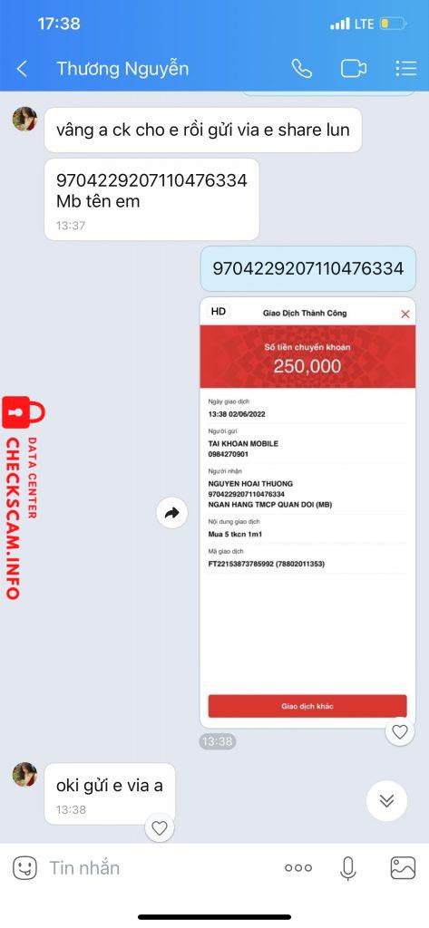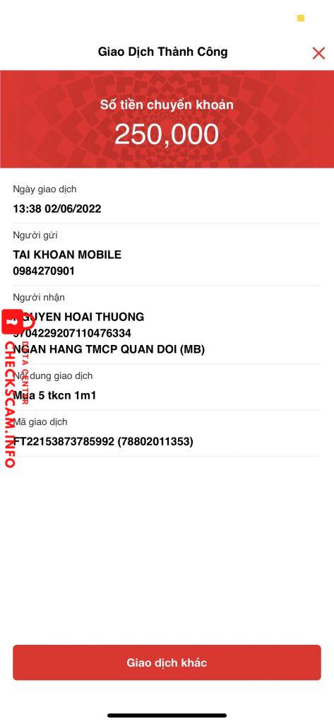 Scammer Alert: Nguyen Hoai Thuong Reported: November 16, 2024 Scammer Information Full Name: Nguyen Hoai Thuong Payment Gate: 9704229207110476334 Payment Account: 9704229207110476334 Category: Marketplace scams Source: Checkscam Evidence Files Report Description Lừa đảo bán hàng VIA + TKCN các loại, bank xong mất hút không rep Comments Your comment Add Comment No comments yet. Be the first to share your experience with this scammer.