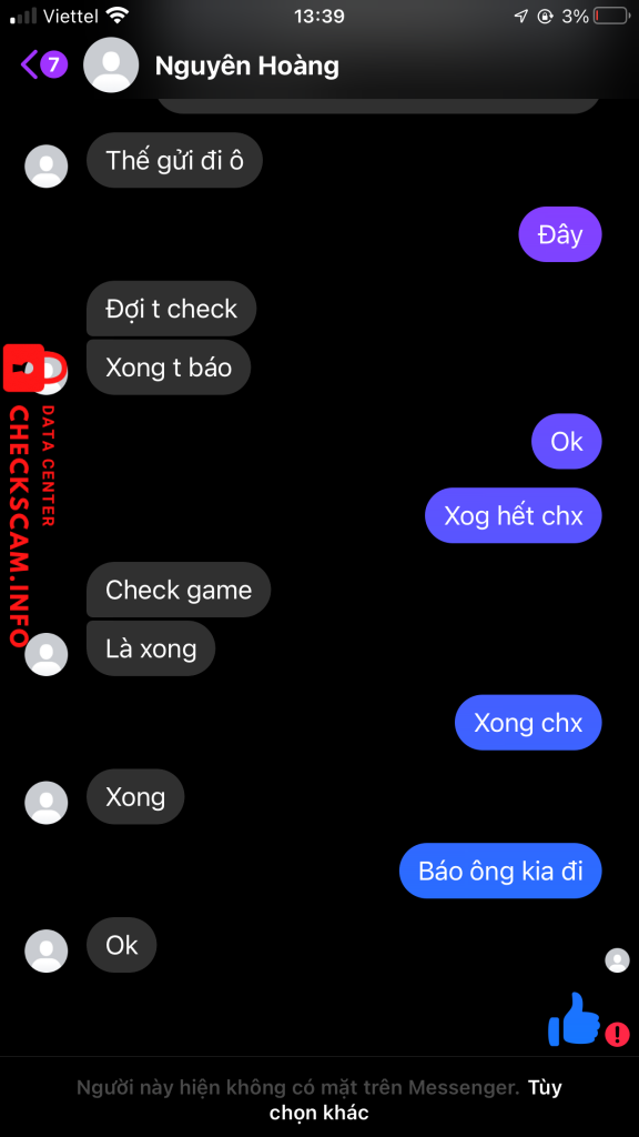 Tôi con acc bán có gdtg với ông này ông này bank tiền cho ông Nguyên hoàng r tôi với đưa acc cho nó check xong hết ông kia bảo đưa stk momo ghi mỗi chữ 500 xong out vừa ra đã block fb :((