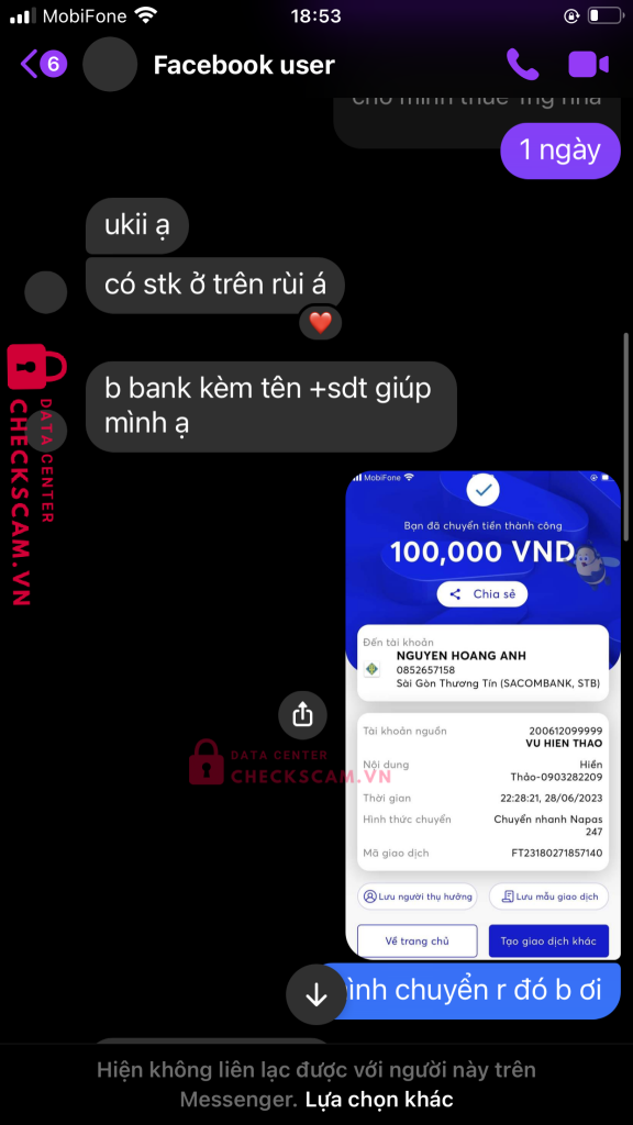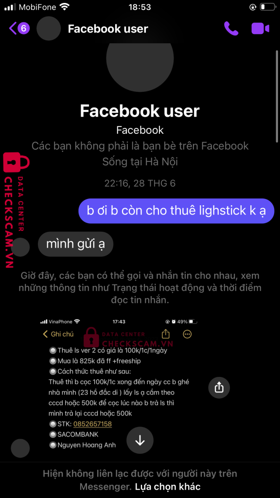 Scammer Alert: Nguyen Hoang Anh Reported: November 16, 2024 Scammer Information Full Name: Nguyen Hoang Anh Payment Gate: saocombank Payment Account: 0852657158 Category: Marketplace scams Source: Checkscam Evidence Files Report Description Comments Your comment Add Comment No comments yet. Be the first to share your experience with this scammer.