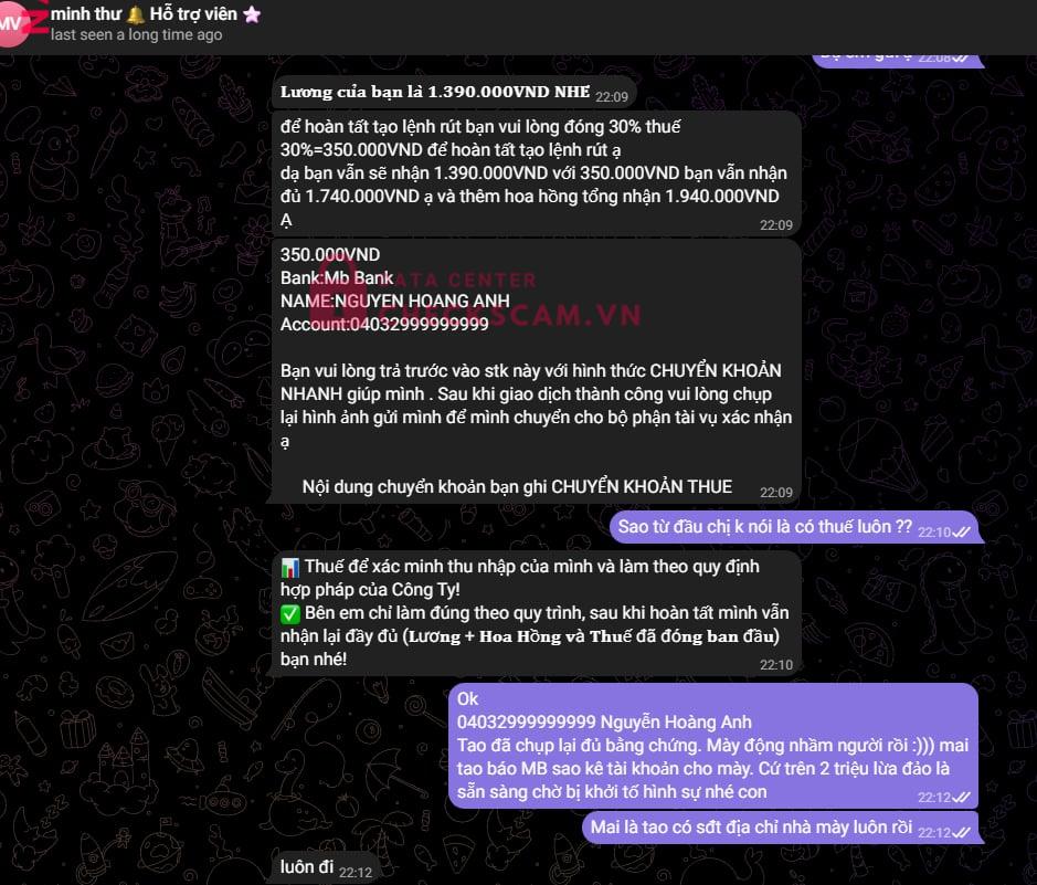 Scammer Alert: NGUYEN HOANG ANH Reported: March 7, 2025 Scammer Information Full Name: NGUYEN HOANG ANH Payment Gate: MBBANK Payment Account: 04032999999999 Category: Marketplace scams Source: Checkscam Evidence Files Report Description Scam trên telegram, hình thức làm nhiệm vụ, quan tâm các trang trên zalo Comments Your comment Add Comment No comments yet. Be the first to share your experience with this scammer.