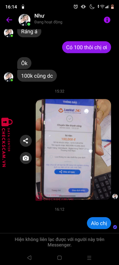 Scammer Alert: NGUYEN HOANG BAO Reported: November 16, 2024 Scammer Information Full Name: NGUYEN HOANG BAO Payment Gate: Vietinbank Payment Account: 107872494294 Category: Marketplace scams Source: Checkscam Evidence Files Report Description Scam mọi người nên né Comments Your comment Add Comment No comments yet. Be the first to share your experience with this scammer.