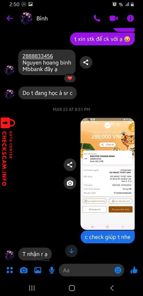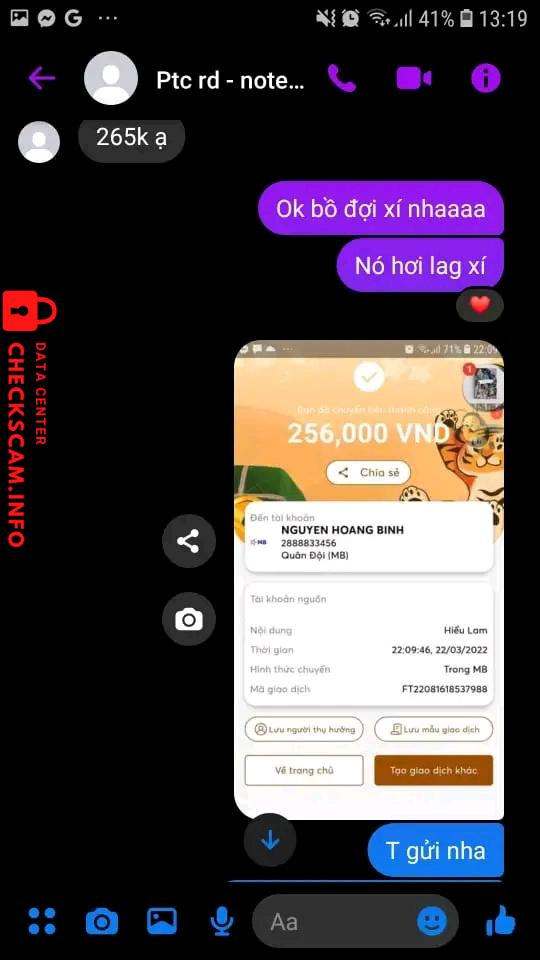 Scammer Alert: Nguyen Hoang Binh Reported: November 16, 2024 Scammer Information Full Name: Nguyen Hoang Binh Payment Gate: MB BANK Payment Account: 2888833456 Category: Marketplace scams Source: Checkscam Evidence Files Report Description Lừa đảo , ck tiền xong bây giờ khoá acc và không liên lạc được nữa Comments Your comment Add Comment No comments yet. Be the first to share your experience with this scammer.