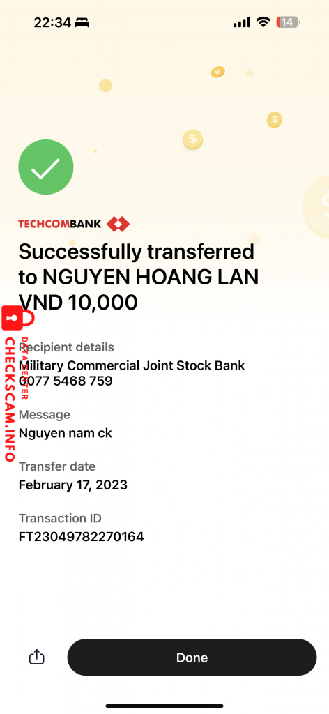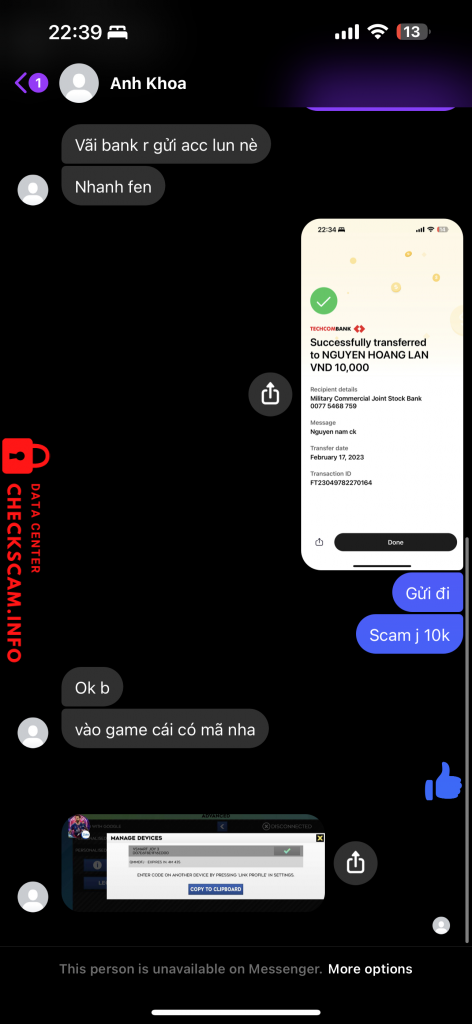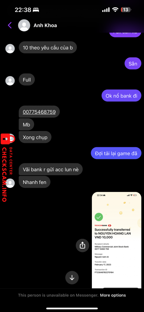 Scammer Alert: NGUYEN HOANG LAN Reported: November 16, 2024 Scammer Information Full Name: NGUYEN HOANG LAN Payment Gate: Mb bank Payment Account: 00775468759 Category: Marketplace scams Source: Checkscam Evidence Files Report Description Scam 10k mua acc dls 2023 Comments Your comment Add Comment No comments yet. Be the first to share your experience with this scammer.