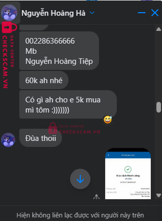 Scammer Alert: Nguyễn Hoàng Tiệp Reported: November 16, 2024 Scammer Information Full Name: Nguyễn Hoàng Tiệp Payment Gate: MBBank Payment Account: 002286366666 Category: Marketplace scams Source: Checkscam Evidence Files Report Description Mua vps 2 ngày die ko bảo hành, chặn ib Comments Your comment Add Comment No comments yet. Be the first to share your experience with this scammer.