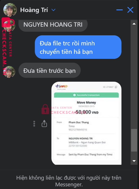 Scammer Alert: NGUYEN HOANG TRI Reported: November 16, 2024 Scammer Information Full Name: NGUYEN HOANG TRI Payment Gate: MB Bank Payment Account: 2270130102000 Category: Marketplace scams Source: Checkscam Evidence Files Report Description Lừa đảo mua tài liệu 123doc Comments Your comment Add Comment No comments yet. Be the first to share your experience with this scammer.