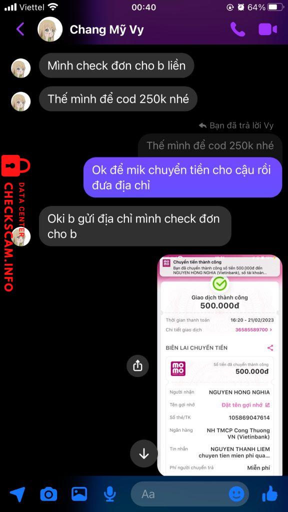 Scammer Alert: NGUYEN HONG NGHIA Reported: November 16, 2024 Scammer Information Full Name: NGUYEN HONG NGHIA Payment Gate: Vietinbank Payment Account: 105869047614 Category: Marketplace scams Source: Checkscam Evidence Files Report Description Tạo đơn hàng đã rồi mày khoản 3-4 ngày chưa giao cho người ta và cũng đã ko thèm nói 1 tiếng nào luôn Comments Your comment Add Comment No comments yet. Be the first to share your experience with this scammer.