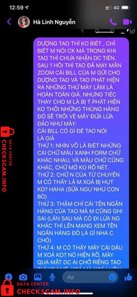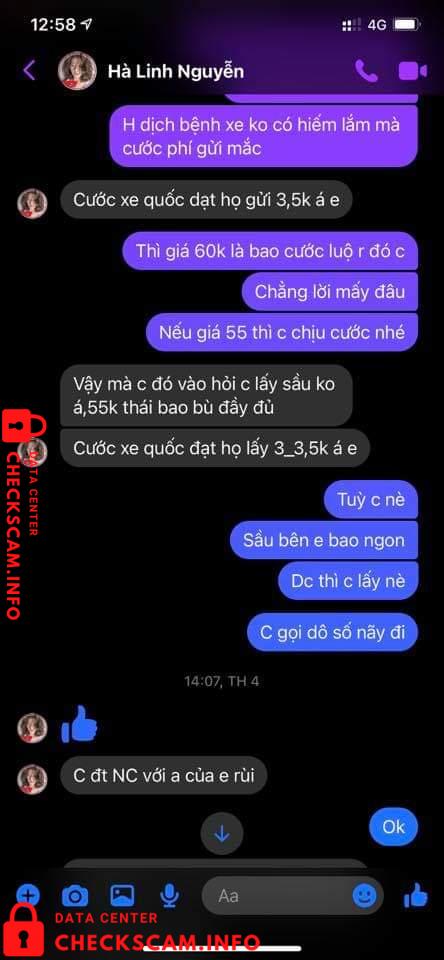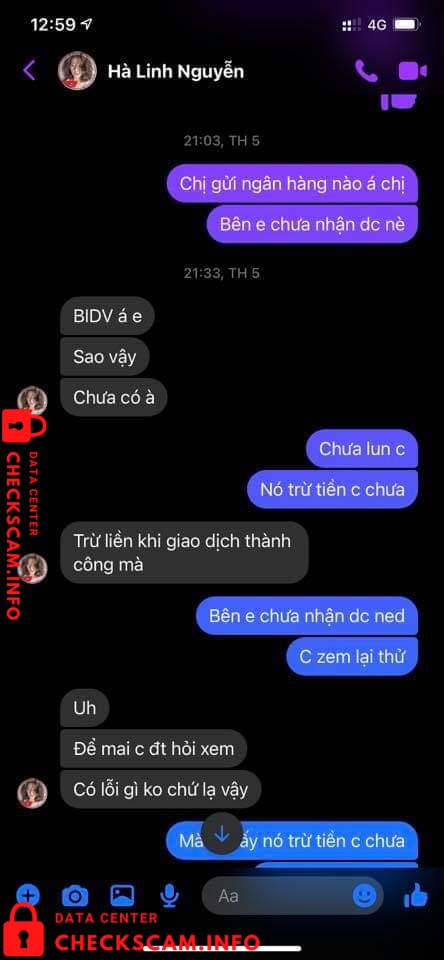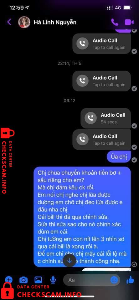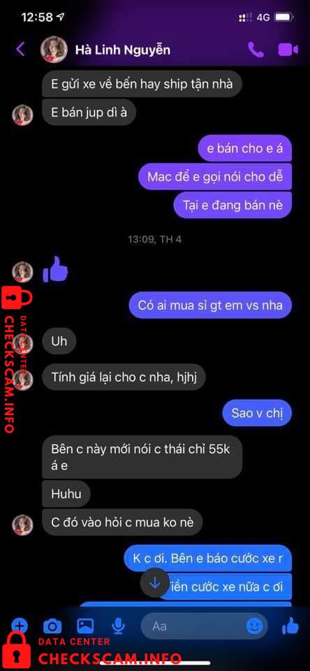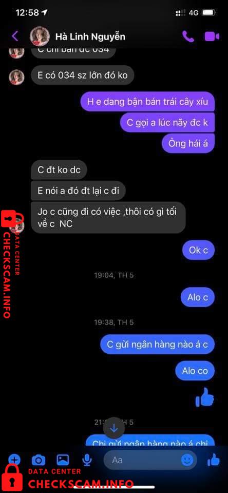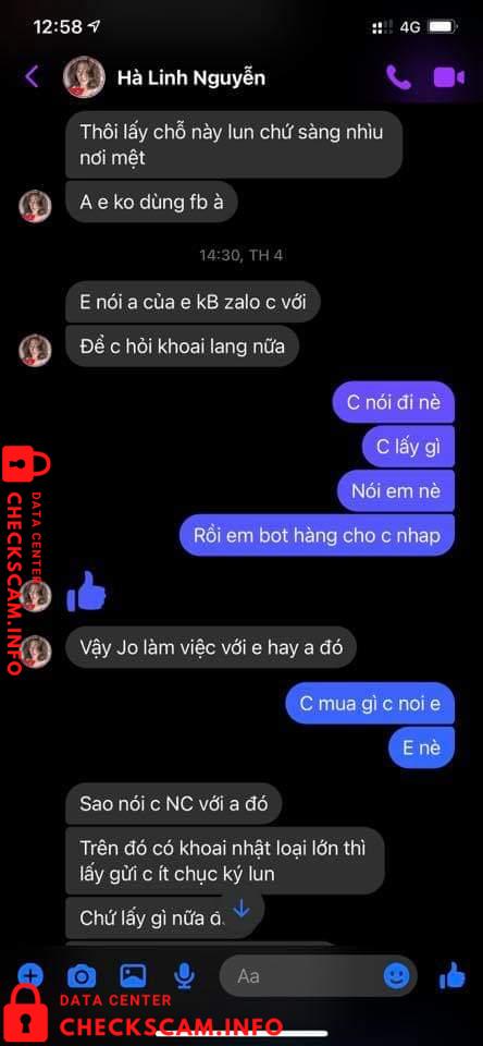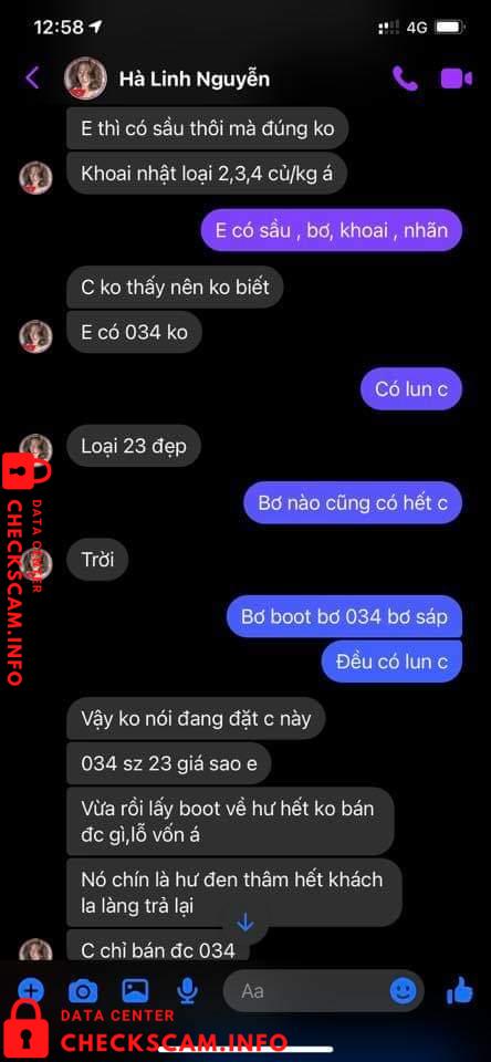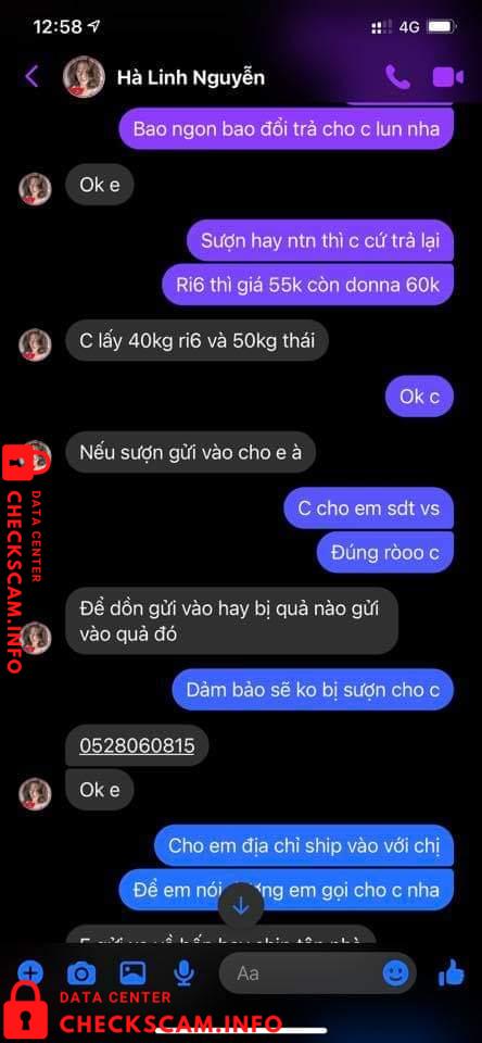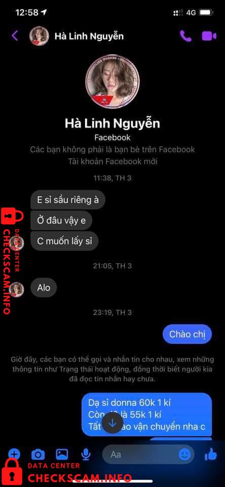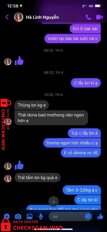 Vào 1 ngày đẹp trời thì cái con mẹ HÀ LINH NGUYỄN (em có chụp phía dưới) nó ib em hỏi giá sầu riêng, em vẫn nói chuyện với nó tử tế như 1 ng bán hàng. Nhưng không nó thủ đoạn lắm mn ạ. Nó hỏi em đủ thứ nào là sầu riêng ri6 bn, dônna bn? Rồi lấy chị 40kg ri6 và 50kg donna, Đoạn chat vẫn còn y đó. Cái bắt đầu trả giá 1 hồi xong sn lên kế hoạch dã vờ nói chỗ kia bán giá thấp hơn, em vẫn ok chị cứ mua chỗ khác. 1 hồi sau quay lại nói thôi lấy bên em cho tiện chớ bên kia vận chuyển trung chuyển cmg đó em ko biết.