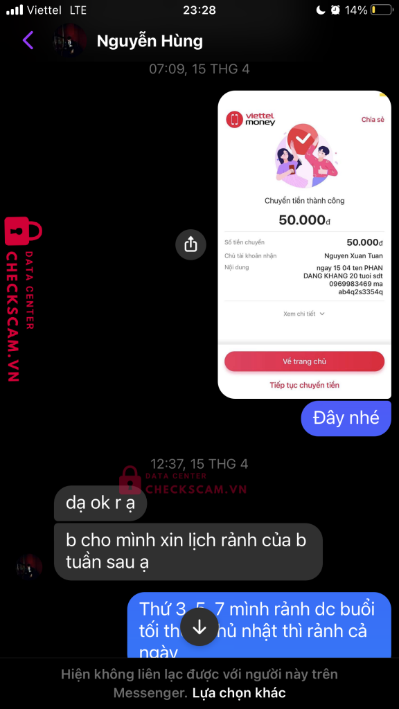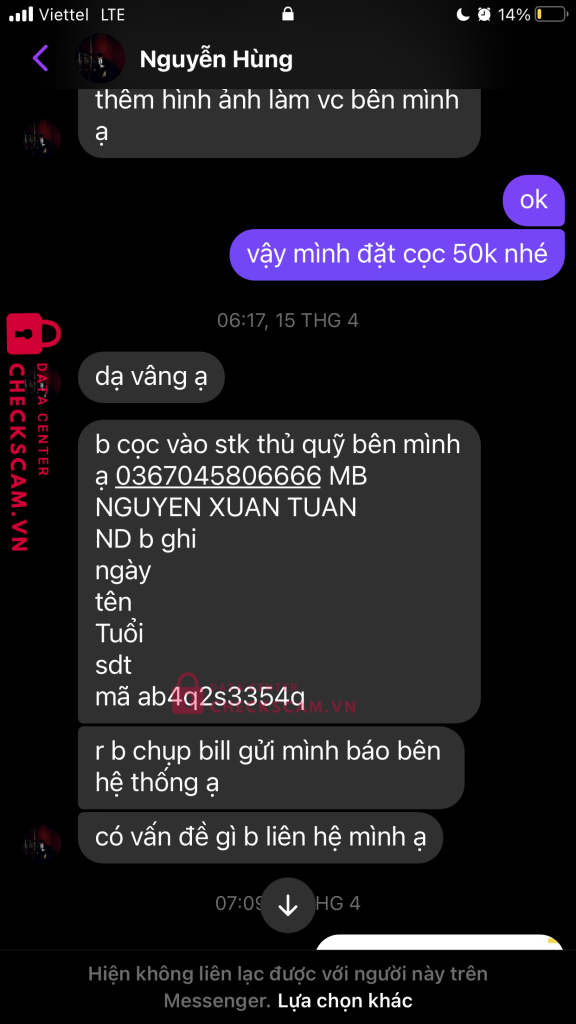 Scammer Alert: Nguyễn hùng Reported: November 16, 2024 Scammer Information Full Name: Nguyễn hùng Payment Gate: MB bank Payment Account: 0367045806666 Category: Marketplace scams Source: Checkscam Evidence Files Report Description Lừa đảo việc làm online Comments Your comment Add Comment No comments yet. Be the first to share your experience with this scammer.