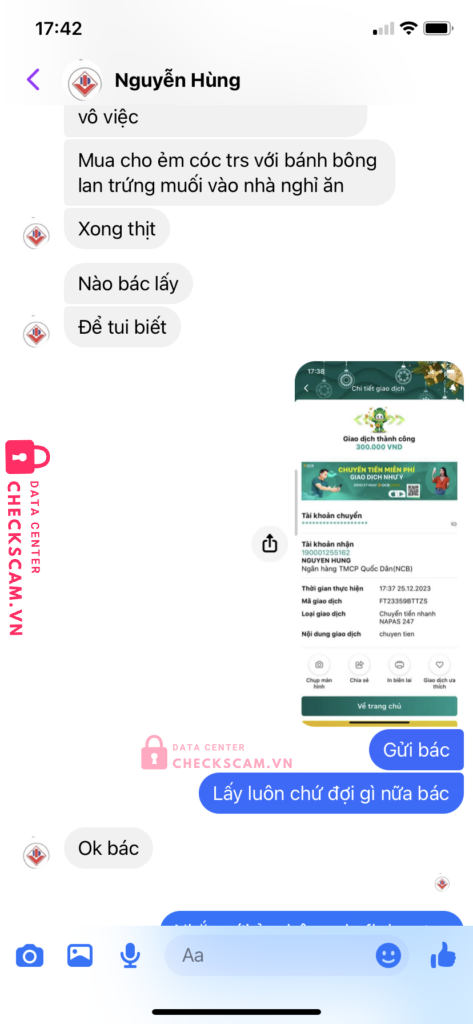 Scammer Alert: Nguyen Hung Reported: November 16, 2024 Scammer Information Full Name: Nguyen Hung Payment Gate: Ncb Payment Account: 190001255162 Category: Marketplace scams Source: Checkscam Evidence Files Report Description Lừa đảo, share kèo, nhận tiền xong lặn. Comments Your comment Add Comment No comments yet. Be the first to share your experience with this scammer.