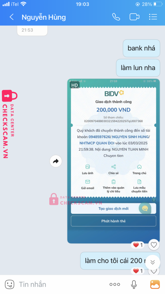 Scammer Alert: Nguyễn Hùng Reported: March 7, 2025 Scammer Information Full Name: Nguyễn Hùng Payment Gate: MBBANK Payment Account: 0948597626 Category: Marketplace scams Source: Checkscam Evidence Files Report Description tôi có thấy trên mạng dịch vụ làm bp game fifa online 4 và tôi có ib người này nhờ làm khi tôi bank tiền xong không chặn tôi ngay mà 3h sáng mới chặn Comments Your comment Add Comment No comments yet. Be the first to share your experience with this scammer.