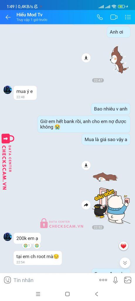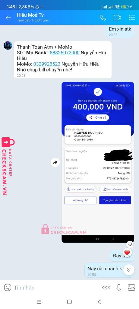 Tên tài khoản: Nguyễn Hữu Hiếu, tên tiktok, tele thường để là Hiếu Mod thật ra là Huân ios đổi tên sang Hiếu mod, đối tượng này là lừa đảo chuyên nghiệp, lúc nhắn nhận tiền sẽ rất nhanh, sau đó gửi hack iphone cho andr và bảo là android phải root, lại dụ mua thêm root và chặn