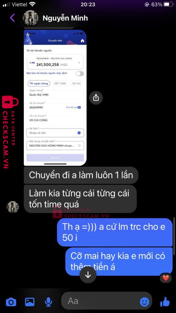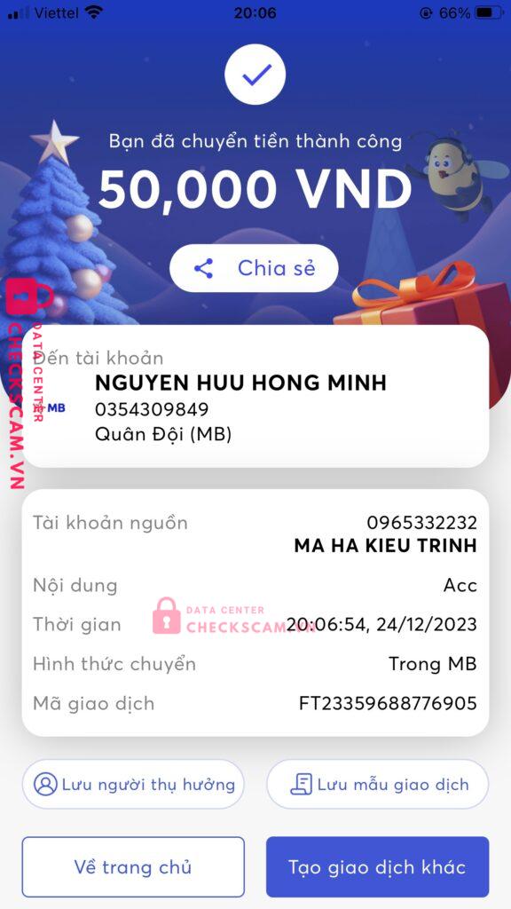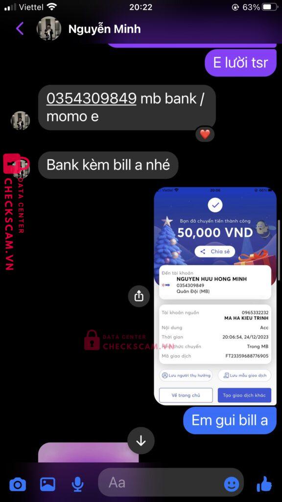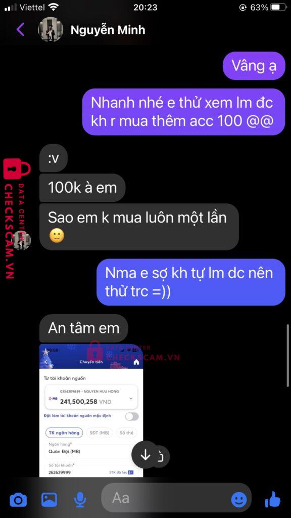 Scammer Alert: NGUYEN HUU HONG MINH Reported: November 16, 2024 Scammer Information Full Name: NGUYEN HUU HONG MINH Payment Gate: MB bank Payment Account: 0354309849 Category: Marketplace scams Source: Checkscam Evidence Files Report Description chuyển được 50k lên checkscam check thì mới thấy có tố cáo, cũng may chưa chuyển 100 còn lại Comments Your comment Add Comment No comments yet. Be the first to share your experience with this scammer.