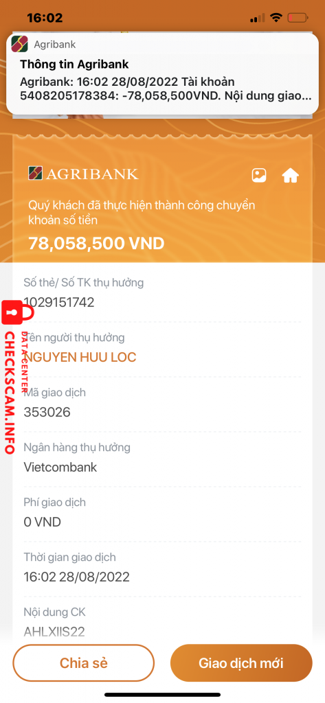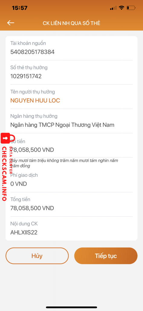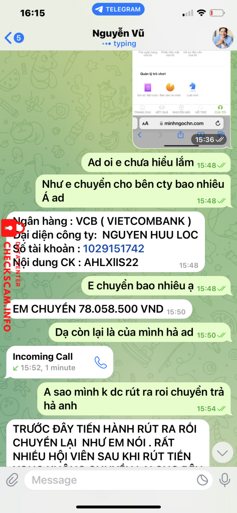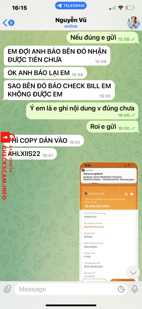 Scammer Alert: Nguyễn hữu lộc Reported: November 16, 2024 Scammer Information Full Name: Nguyễn hữu lộc Payment Gate: Vietcombank Payment Account: 1029151742 Category: Marketplace scams Source: Checkscam Evidence Files Report Description Tôi muốn tố cáo đã lừa tiền của tôi mong công an vào cuộc lấy lại giúp em ạ Comments Your comment Add Comment No comments yet. Be the first to share your experience with this scammer.