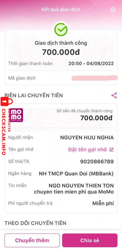 Scammer Alert: NGUYEN HUU NGHIA Reported: November 16, 2024 Scammer Information Full Name: NGUYEN HUU NGHIA Payment Gate: MB Bank Payment Account: 9020866789 Category: Marketplace scams Source: Checkscam Evidence Files Report Description lừa đảo bank, ko gửi hàng , scam Comments Your comment Add Comment No comments yet. Be the first to share your experience with this scammer.