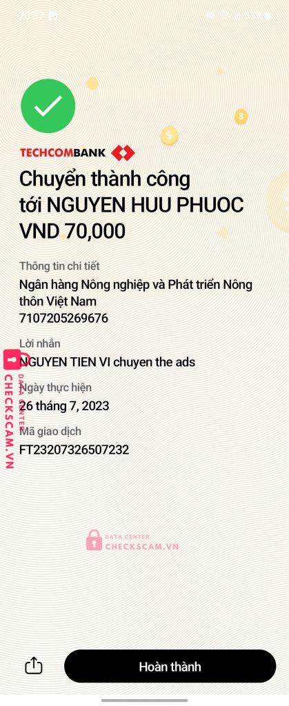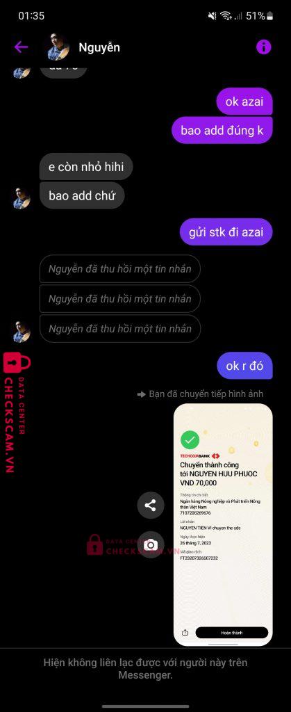 Scammer Alert: NGUYỄN HỮU PHƯỚC Reported: November 16, 2024 Scammer Information Full Name: NGUYỄN HỮU PHƯỚC Payment Gate: Agribank Payment Account: 7107205269676 Category: Marketplace scams Source: Checkscam Evidence Files Report Description NGUYỄN HỮU PHƯỚC, lừa đảo tinh vi. Scam từ 70k Comments Your comment Add Comment No comments yet. Be the first to share your experience with this scammer.