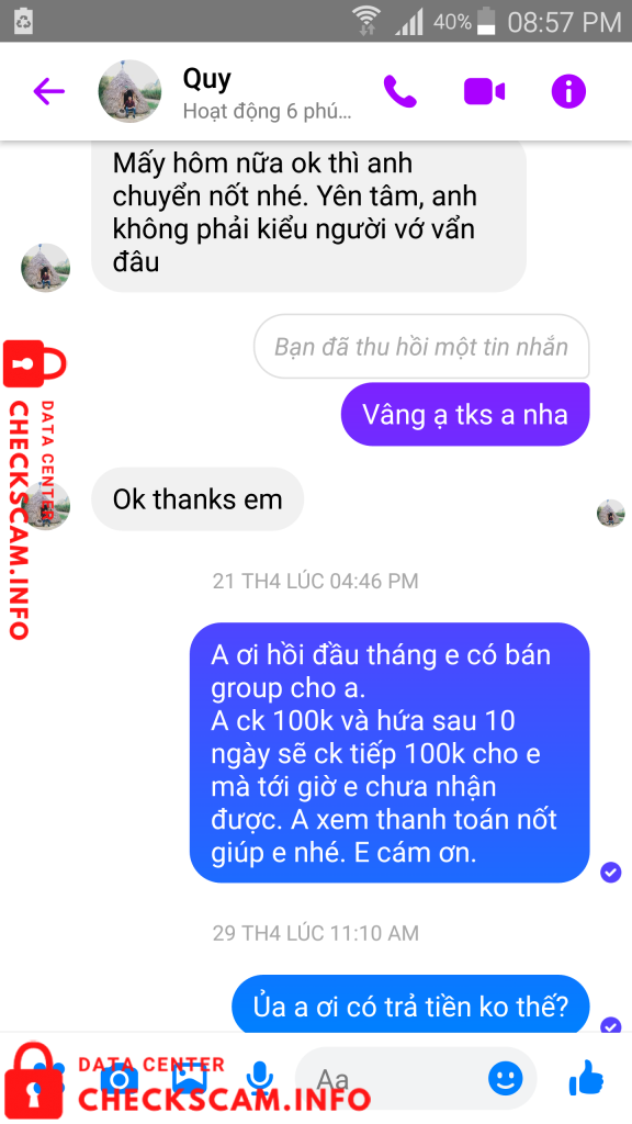 Scammer Alert: Nguyễn Hữu Quy Reported: November 16, 2024 Scammer Information Full Name: Nguyễn Hữu Quy Payment Gate: Vcb Payment Account: 0491000169770 Category: Marketplace scams Source: Checkscam Evidence Files Report Description Xin phép ad duyệt bài dùm em Comments Your comment Add Comment No comments yet. Be the first to share your experience with this scammer.