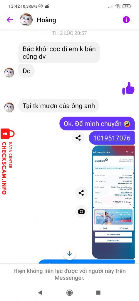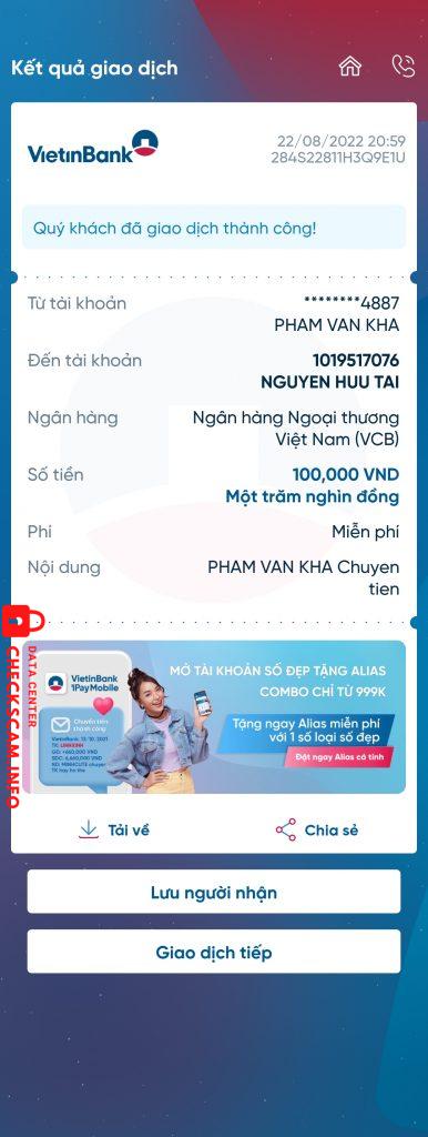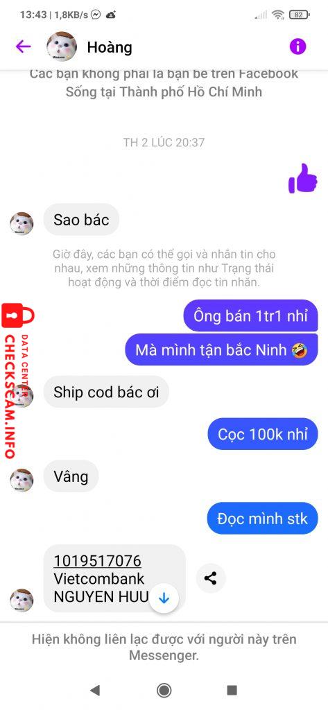 Scammer Alert: NGUYEN HUU TAI Reported: November 16, 2024 Scammer Information Full Name: NGUYEN HUU TAI Payment Gate: Vietcombank Payment Account: 1019517076 Category: Marketplace scams Source: Checkscam Evidence Files Report Description Lừa tiền cọc Comments Your comment Add Comment No comments yet. Be the first to share your experience with this scammer.