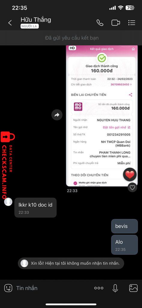 Scammer Alert: NGUYEN HUU THANG Reported: November 16, 2024 Scammer Information Full Name: NGUYEN HUU THANG Payment Gate: MB BANK Payment Account: 001234291005 Category: Marketplace scams Source: Checkscam Evidence Files Report Description Scam ngọc rồng Comments Your comment Add Comment No comments yet. Be the first to share your experience with this scammer.