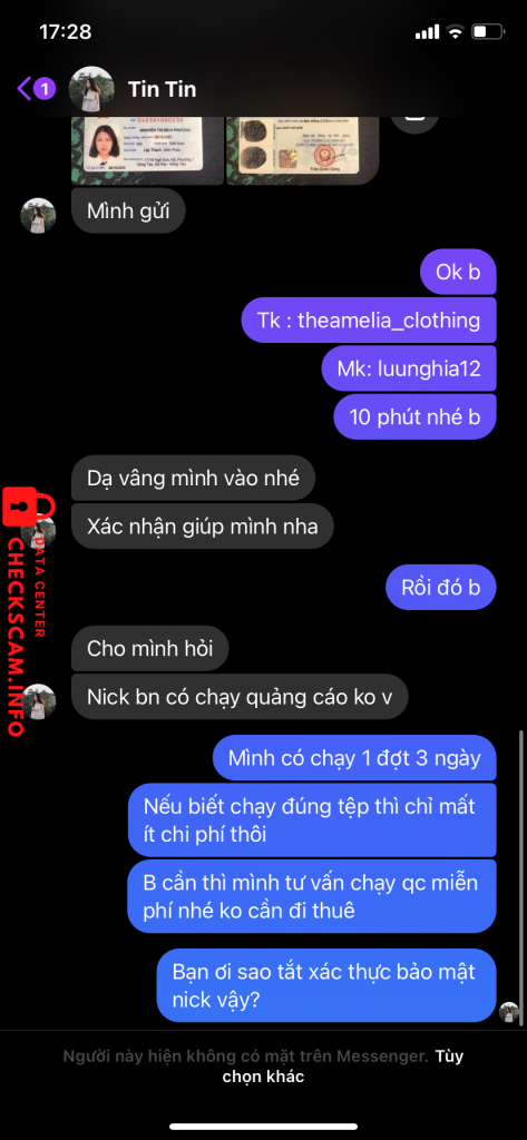Scammer Alert: Nguyen Huy Reported: November 16, 2024 Scammer Information Full Name: Nguyen Huy Phone Number: 0984777199 Payment Gate: MB Bank Payment Account: 021220056666 Category: Marketplace scams Source: Checkscam Evidence Files Report Description Lừa lấy mất 1 tài khoản instagram ~ 4 triệu đồng Comments Your comment Add Comment No comments yet. Be the first to share your experience with this scammer.