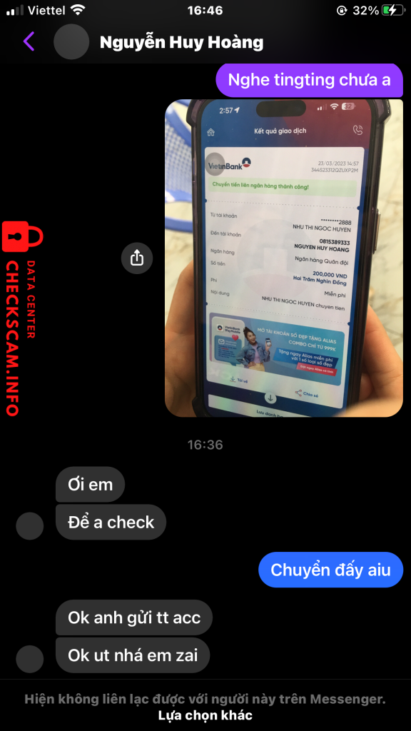 Scammer Alert: Nguyễn Huy Hoàng Reported: November 16, 2024 Scammer Information Full Name: Nguyễn Huy Hoàng Payment Gate: Mb bank Payment Account: 0815389333 Category: Marketplace scams Source: Checkscam Evidence Files Report Description Lừa đảo tiền Comments Your comment Add Comment No comments yet. Be the first to share your experience with this scammer.