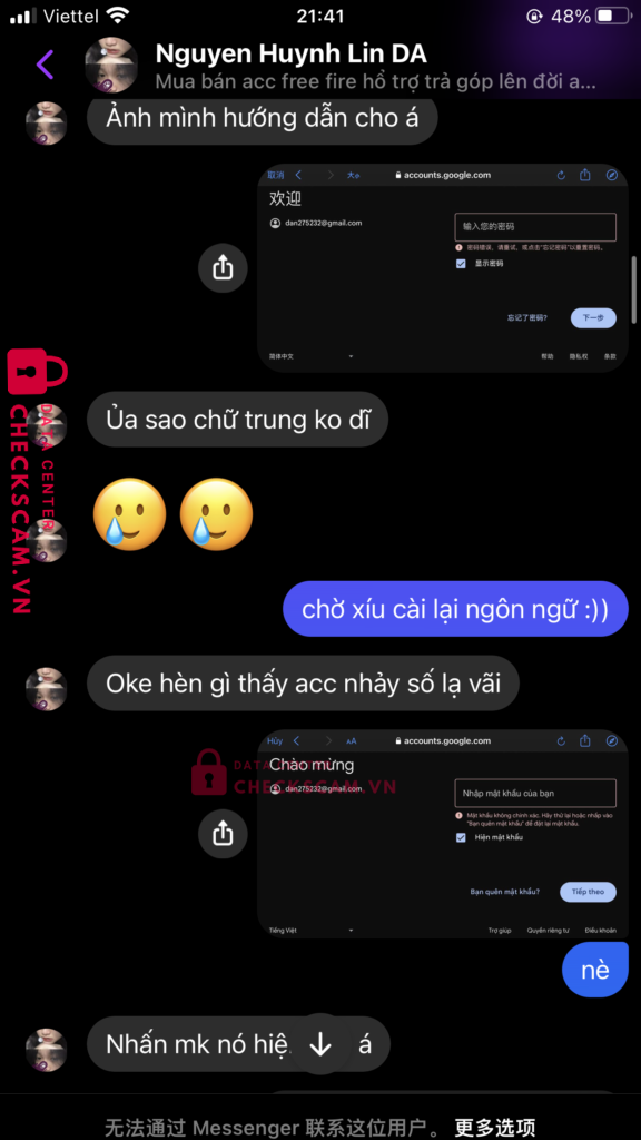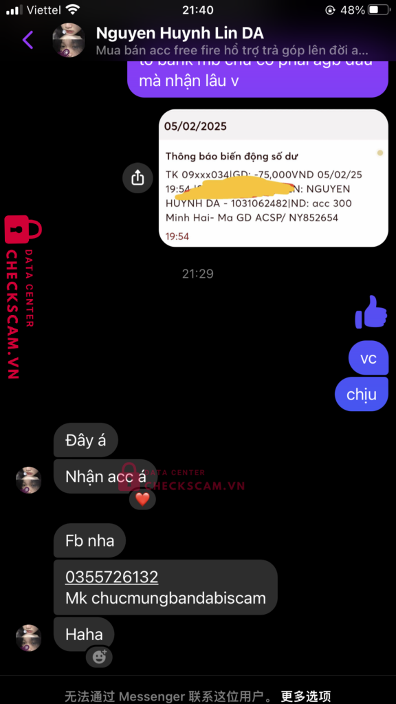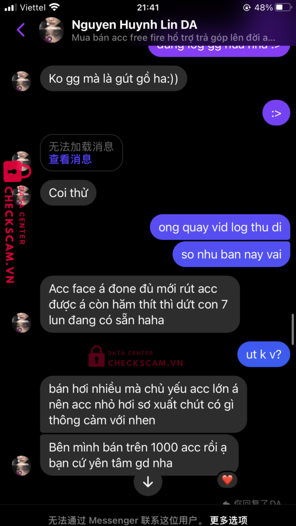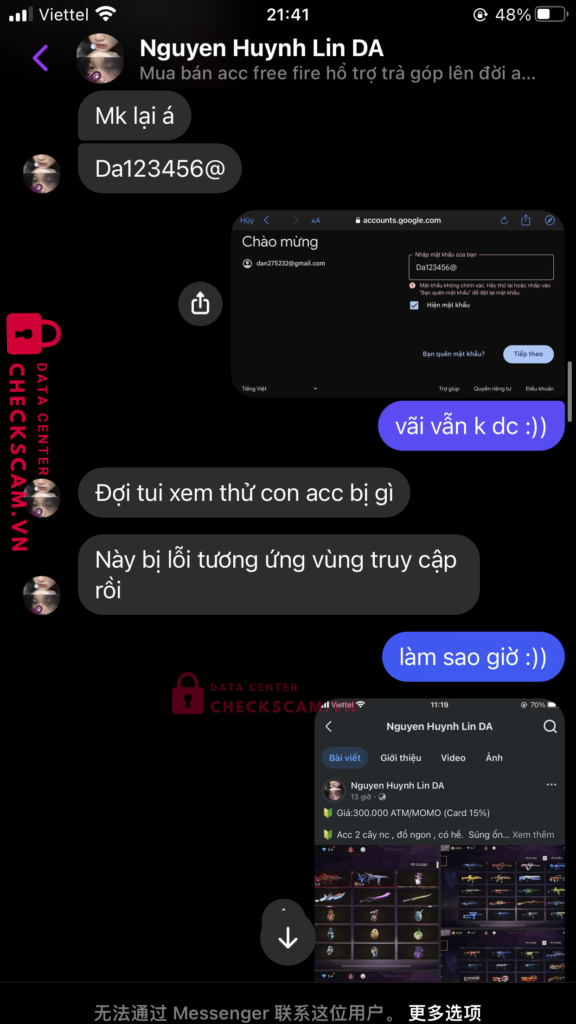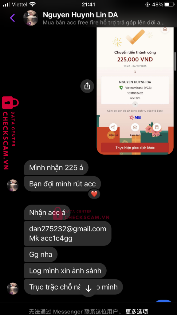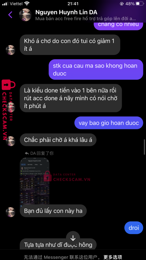 Scammer Alert: Nguyen Huynh Da Reported: March 7, 2025 Scammer Information Full Name: Nguyen Huynh Da Payment Gate: Vietcombank Payment Account: 1031062482 Category: Marketplace scams Source: Checkscam Evidence Files Report Description mua acc ff từ hôm trước xong cứ bảo lỗi này lỗi kia, kêu chuyển thêm tiền để lấy acc khác thì chặn luôn. Nhì nhằng từ hôm trước đến hôm sau Comments Your comment Add Comment No comments yet. Be the first to share your experience with this scammer.