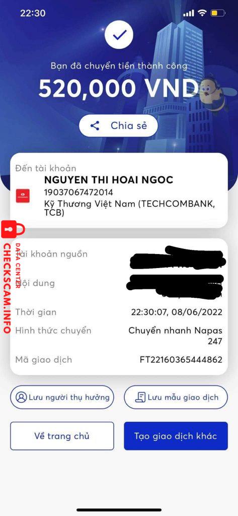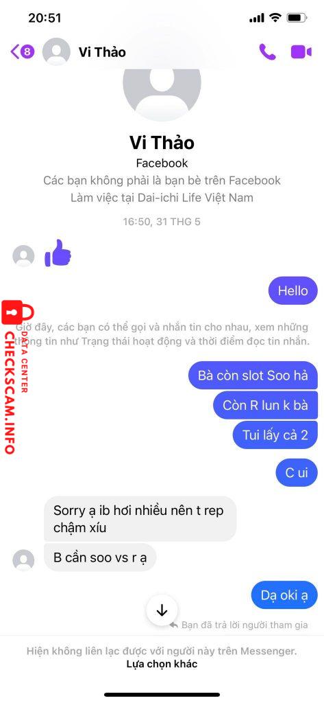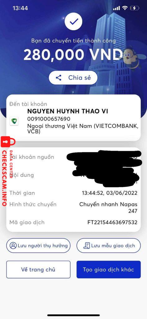 Scammer Alert: NGUYEN HUYNH THAO VI Reported: November 16, 2024 Scammer Information Full Name: NGUYEN HUYNH THAO VI Payment Gate: Vietcombank Payment Account: 0091000657690 Category: Marketplace scams Source: Checkscam Evidence Files Report Description số tiền scam hiện nay đã xấp xỉ 20m Comments Your comment Add Comment No comments yet. Be the first to share your experience with this scammer.