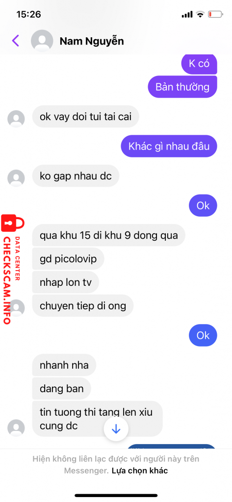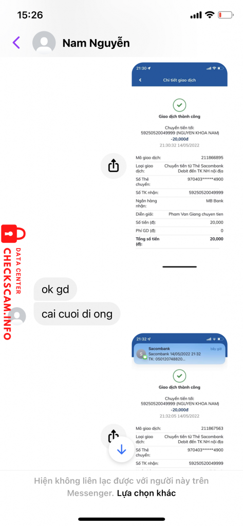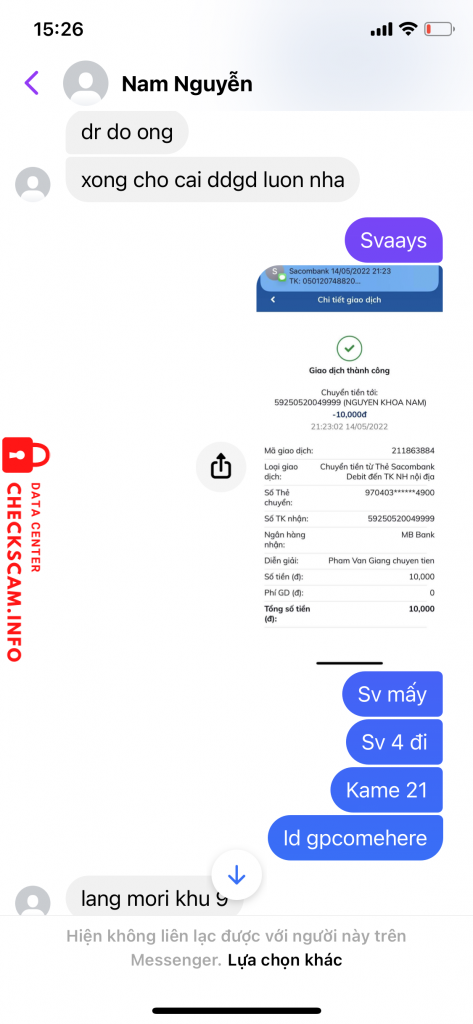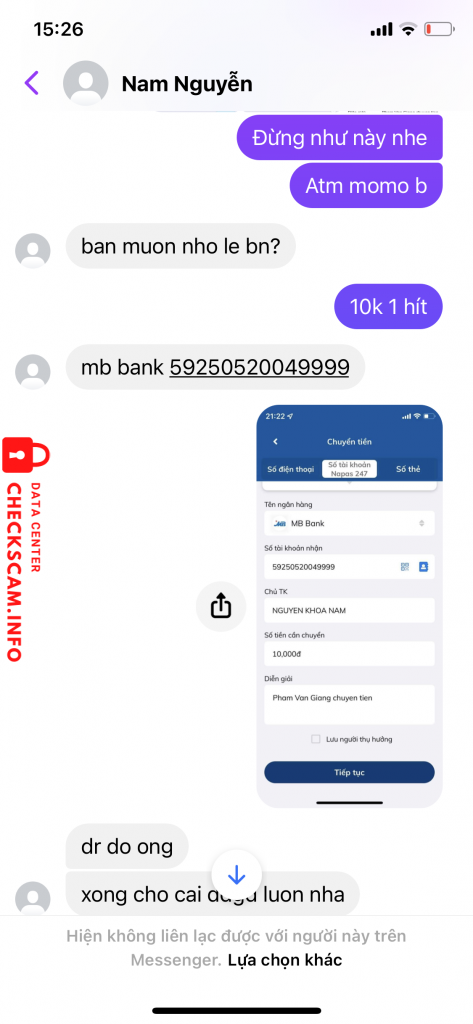Scammer Alert: Nguyen khoa nam Reported: November 16, 2024 Scammer Information Full Name: Nguyen khoa nam Payment Gate: Mb bank Payment Account: 59250520049999 Category: Marketplace scams Source: Checkscam Evidence Files Report Description Lừa đảo nr Comments Your comment Add Comment No comments yet. Be the first to share your experience with this scammer.