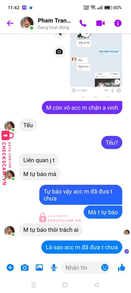 Link fb mình gắn là đứa scam mình , mình có gdtg với nó qua a vinh mình bank tiền cho a vinh xong rồi mình kêu nó đưa acc fb ngâm tý rồi thay mk sợ bị 956 nhưng nó kêu thay hộ mình, mình quên đưa sđt của mình, rồi nó lại lấy mã vô fb của mình vô mess và báo done cho bên gdtg ( nó lấy STK của bạn nó để nhận tiền và bạn nó cũng ko giải quyết cho mình)