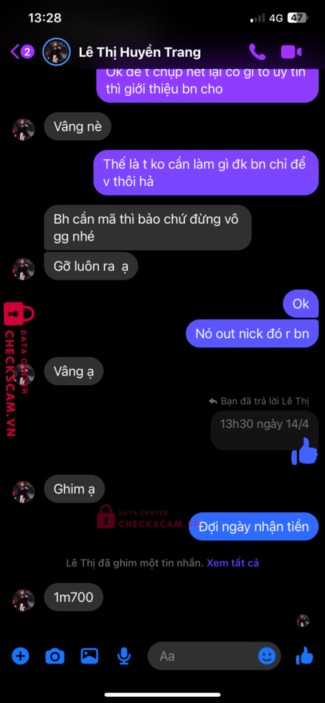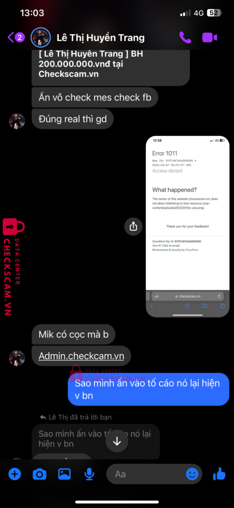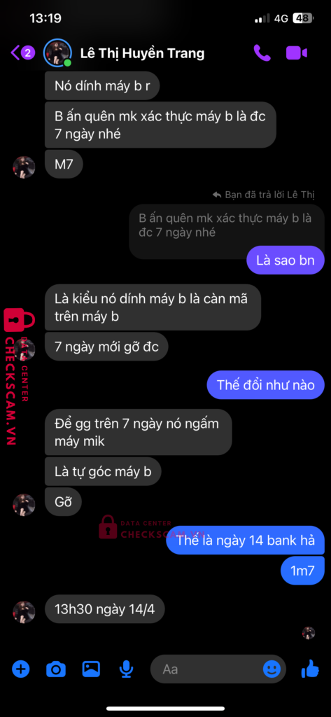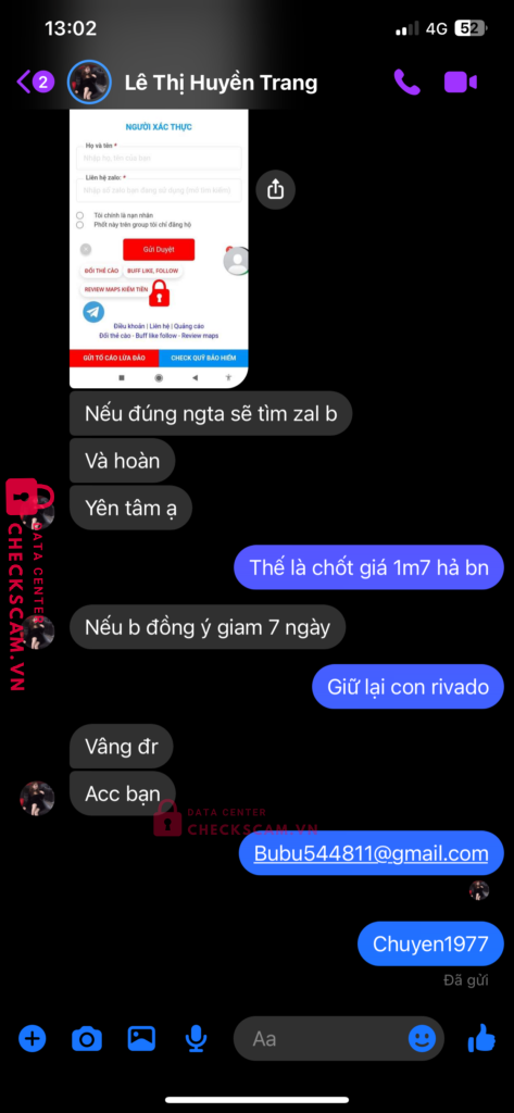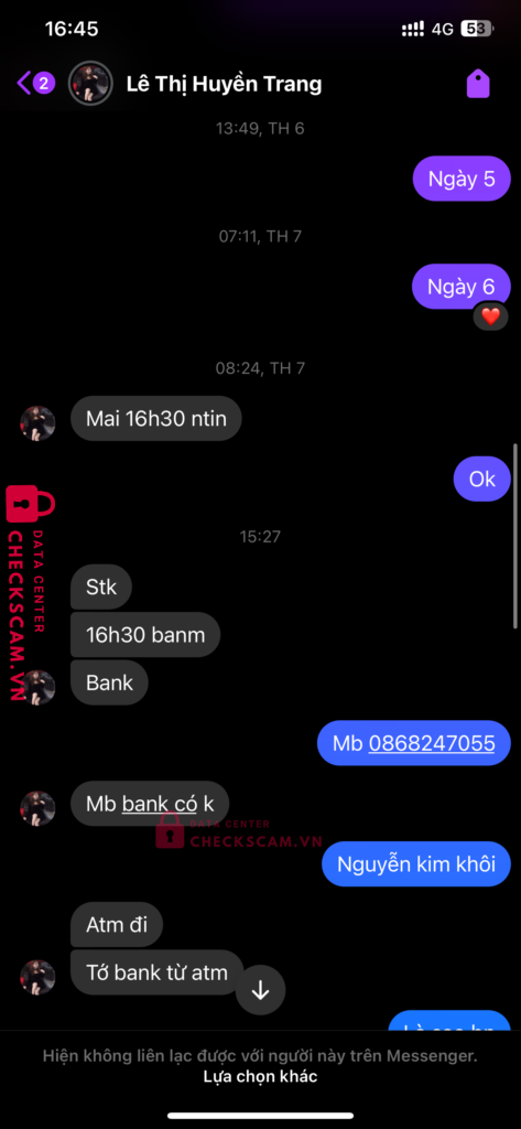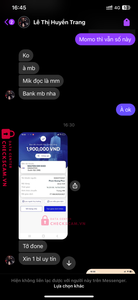 Scammer Alert: NGUYEN KIM KHOI Reported: November 16, 2024 Scammer Information Full Name: NGUYEN KIM KHOI Payment Gate: Mb bank Payment Account: 0868247055 Category: Marketplace scams Source: Checkscam Evidence Files Report Description Giao dịch acc fc mobile hàn quốc scam Bảo đợi 7 ngày mà đến ngày thì gửi bill fake chuyển tiền nhắn lại thì block Comments Your comment Add Comment No comments yet. Be the first to share your experience with this scammer.