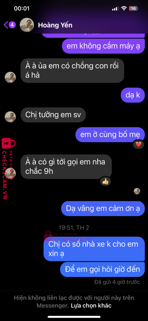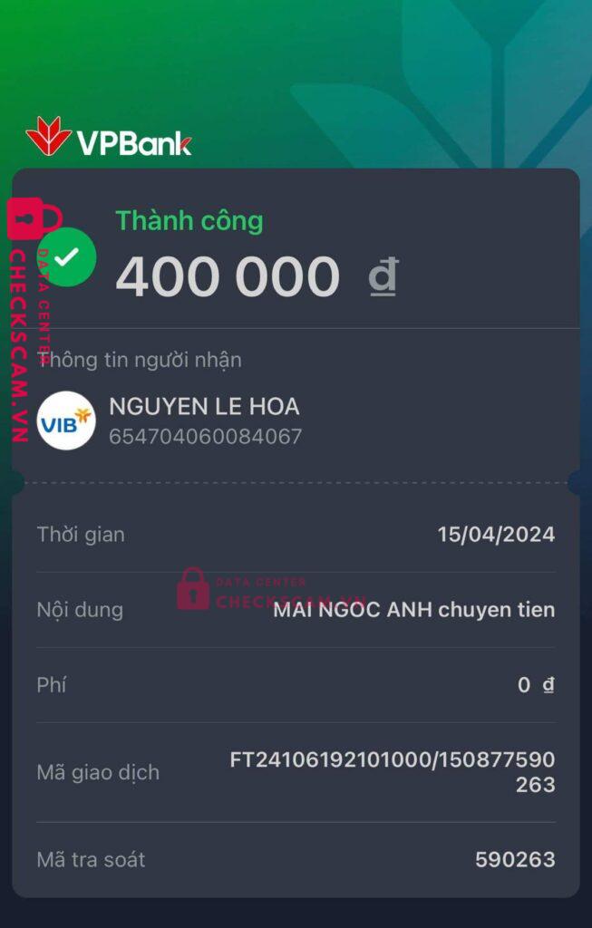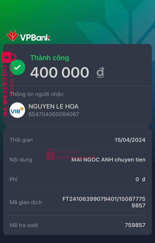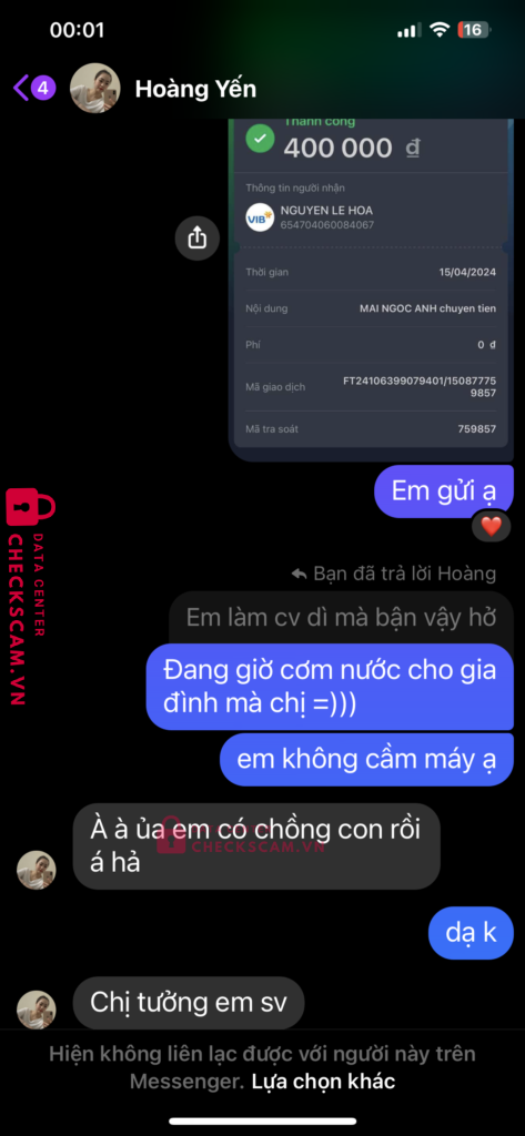 Scammer Alert: Nguyen Le Hoa Reported: November 16, 2024 Scammer Information Full Name: Nguyen Le Hoa Payment Gate: Vib Payment Account: 654704060084067 Category: Marketplace scams Source: Checkscam Evidence Files Report Description Em có mua máy ảnh của chị này. Chị kêu chuyển tiền và gửi máy nhưng sau đó thì chặn tin và cũng không có máy gửi về ạ Comments Your comment Add Comment No comments yet. Be the first to share your experience with this scammer.