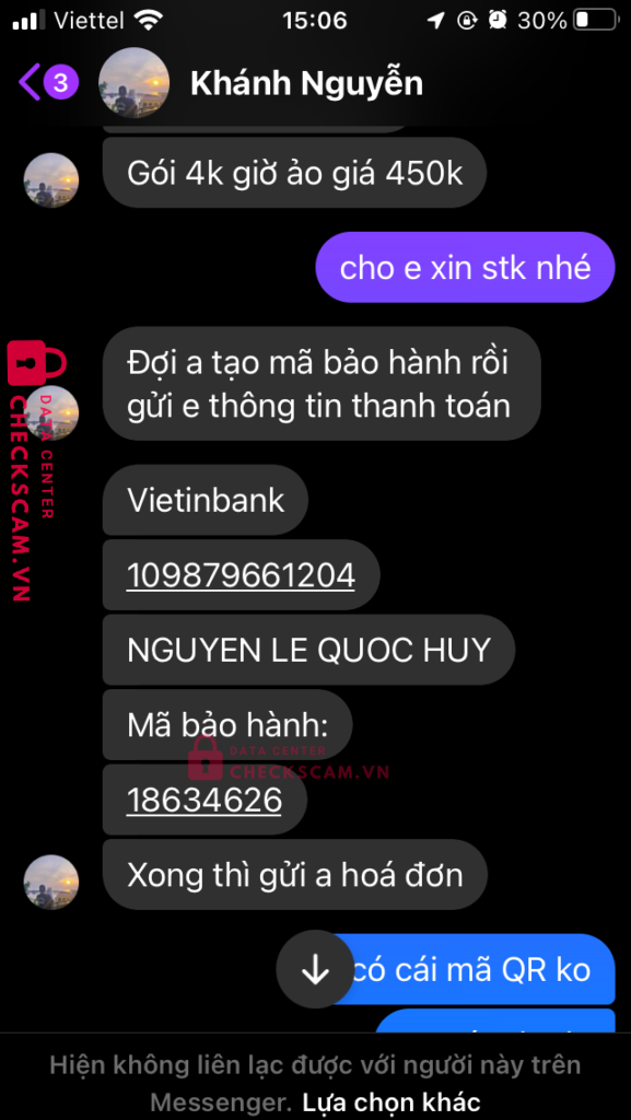 Scammer Alert: nguyen le quoc huy Reported: November 16, 2024 Scammer Information Full Name: nguyen le quoc huy Payment Gate: viettinbank Payment Account: 109879661204 Category: Marketplace scams Source: Checkscam Evidence Files Report Description lừa đảo buff view youtube Comments Your comment Add Comment No comments yet. Be the first to share your experience with this scammer.