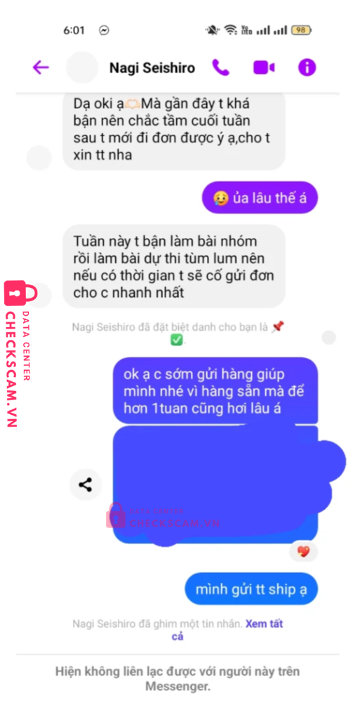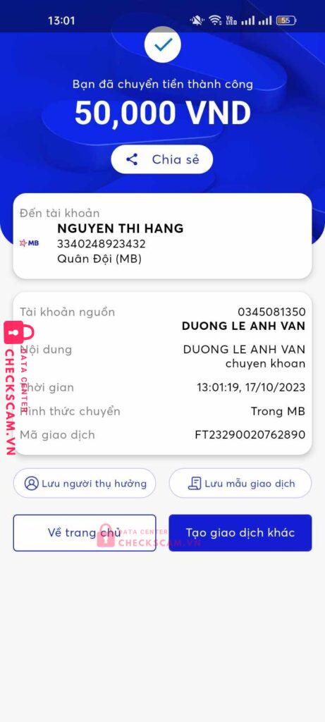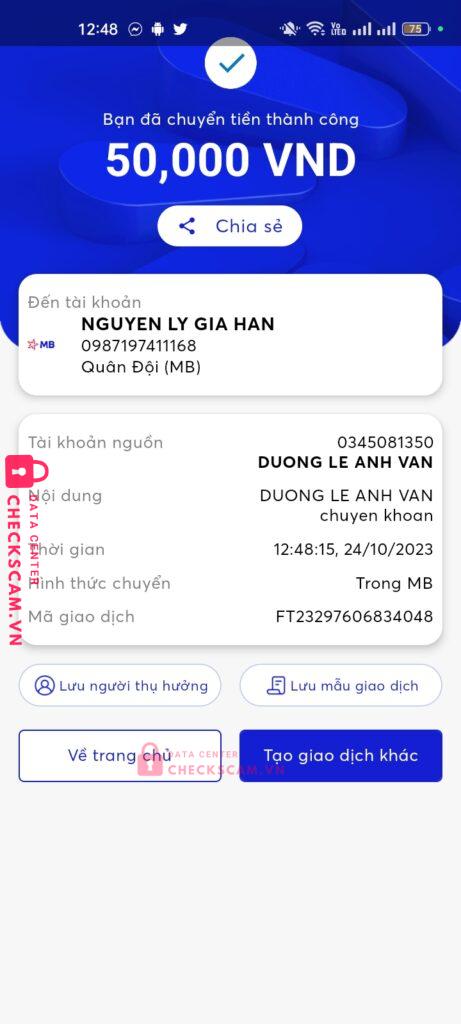 Scammer Alert: NGUYEN LY GIA HAN Reported: November 16, 2024 Scammer Information Full Name: NGUYEN LY GIA HAN Payment Gate: Mb Payment Account: 0987197411168 Category: Marketplace scams Source: Checkscam Evidence Files Report Description con này ban đầu sài stk bị up lên đây tên NGUYEN THI HANG nhm mình kh check nên bị dính , mọi người cảnh giác với stk thứ 2 nha Comments Your comment Add Comment No comments yet. Be the first to share your experience with this scammer.