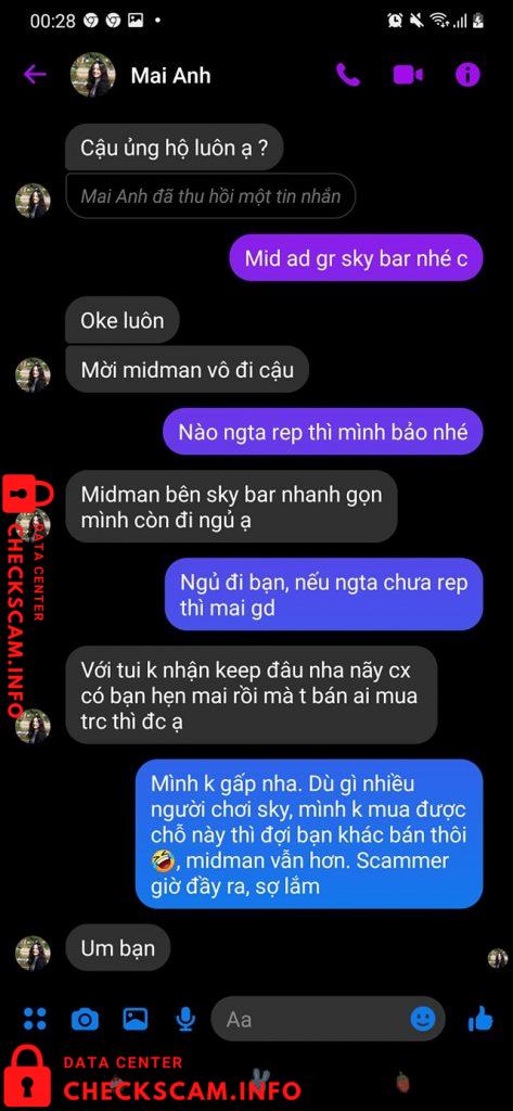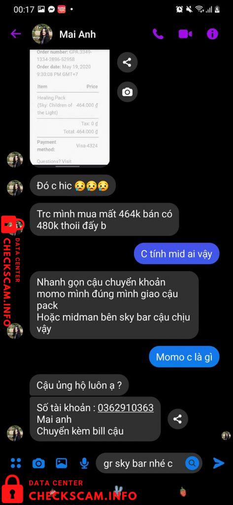 Chắc nhiều bạn bị rồi nhưng mà mình vẫn đăng lên đây. Nguyễn Mai Anh 0362910363 chuyên đi scam của nhiều người rồi. Stk momo này quá quen thuộc, scam từ bên IDV đến Sky. Bạn mình cũng đã từng bị scam 2M. Hôm nay mình đăng bài mua pack, người này cũng có ý định scam mình. Mà mình vừa check, bài đăng của mình vào hôm nay, tài khoản này cũng vừa join group, vừa nhìn là biết scammer . Sau khi ngồi nói chuyện cho vui vậy thôi, thì cuối cùng cũng lộ stk. Nếu những ai có để ý những người bị bạn này scam thì cách nói chuyện là bảo uy tín các kiểu, chịu mid nhưng khá hối người mua.