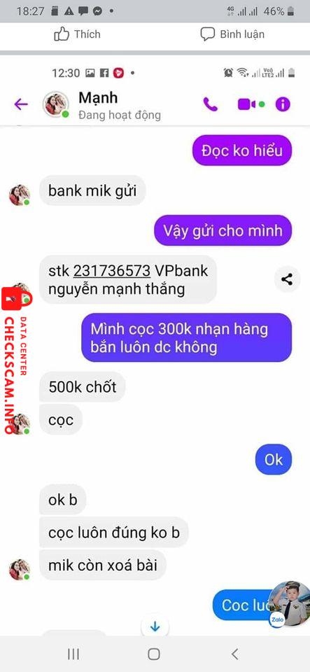 Scammer Alert: Nguyễn Mạnh Thắng Reported: November 16, 2024 Scammer Information Full Name: Nguyễn Mạnh Thắng Payment Gate: VP Bank Payment Account: 231736573 Category: Marketplace scams Source: Checkscam Evidence Files Report Description Thằng này trên chợ đang lừa đảo rất nhiều Anh em mobile .. Với hình thức cod cọc Mệnh giá từ nhỏ tới lớn Ae chú ý Nhé Comments Your comment Add Comment No comments yet. Be the first to share your experience with this scammer.