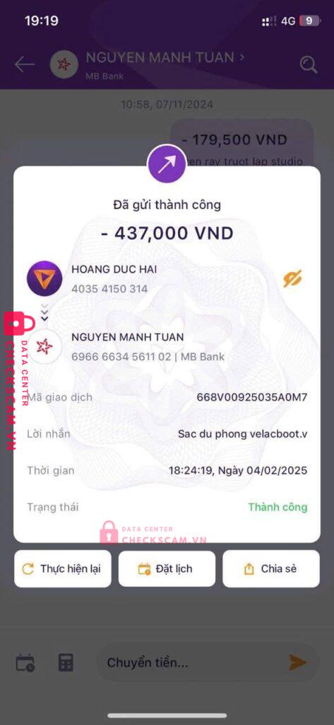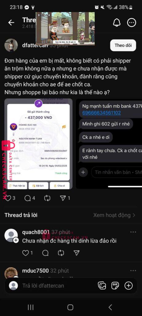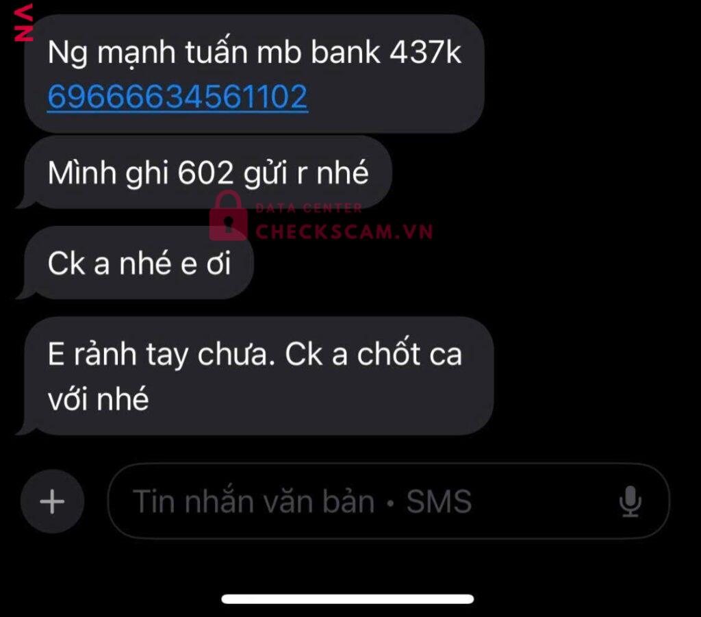 Scammer Alert: Nguyễn Mạnh Tuấn Reported: March 7, 2025 Scammer Information Full Name: Nguyễn Mạnh Tuấn Payment Gate: Mb bank Payment Account: 69666634561102 Category: Marketplace scams Source: Checkscam Evidence Files Report Description Giả dạng shipper giao hàng, lừa đảo chuyển khoản Comments Your comment Add Comment No comments yet. Be the first to share your experience with this scammer.