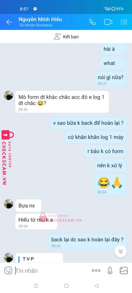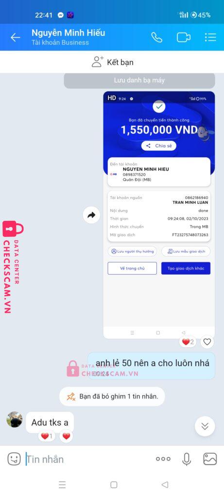 Scammer Alert: Nguyễn Minh Hiếu Reported: November 16, 2024 Scammer Information Full Name: Nguyễn Minh Hiếu Payment Gate: MBBank Payment Account: 0898371520 Category: Marketplace scams Source: Checkscam Evidence Files Report Description scam bán acc k nói time bao , xong bị back thì nói bao 7d , xong back về bán tiếp Comments Your comment Add Comment No comments yet. Be the first to share your experience with this scammer.
