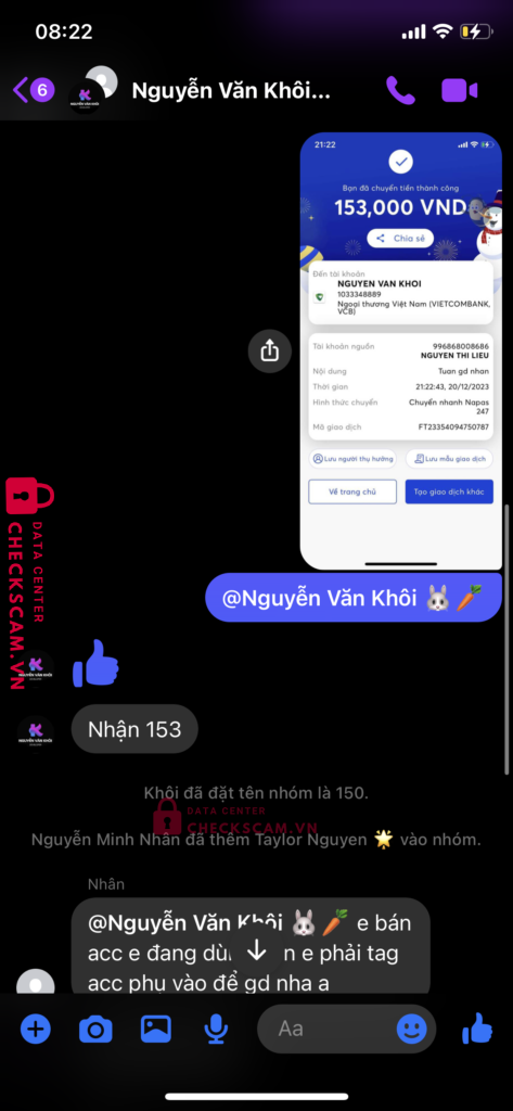 Scammer Alert: NGUYEN MINH NHAN Reported: November 16, 2024 Scammer Information Full Name: NGUYEN MINH NHAN Payment Gate: MB BANK Payment Account: 0374404676 Category: Marketplace scams Source: Checkscam Evidence Files Report Description Back acc Comments Your comment Add Comment No comments yet. Be the first to share your experience with this scammer.