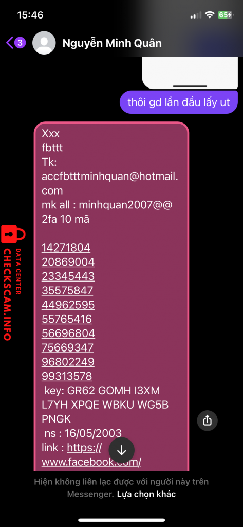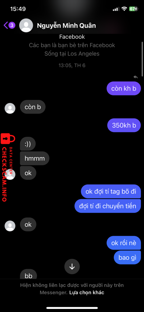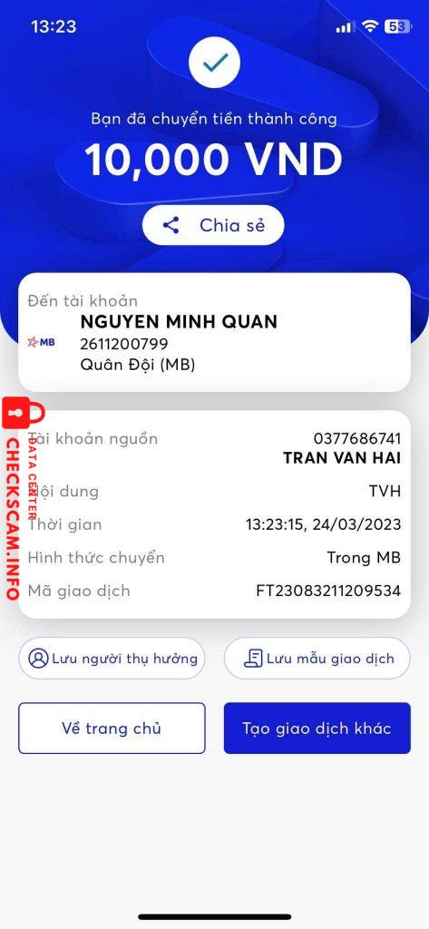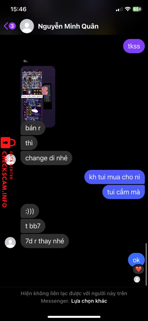Scammer Alert: NGUYEN MINH QUAN Reported: November 16, 2024 Scammer Information Full Name: NGUYEN MINH QUAN Payment Gate: Mb bank Payment Account: 2611200799 Category: Marketplace scams Source: Checkscam Evidence Files Report Description back acc mới bán đc 1 ngày đã block và thay all tt acc Comments Your comment Add Comment No comments yet. Be the first to share your experience with this scammer.