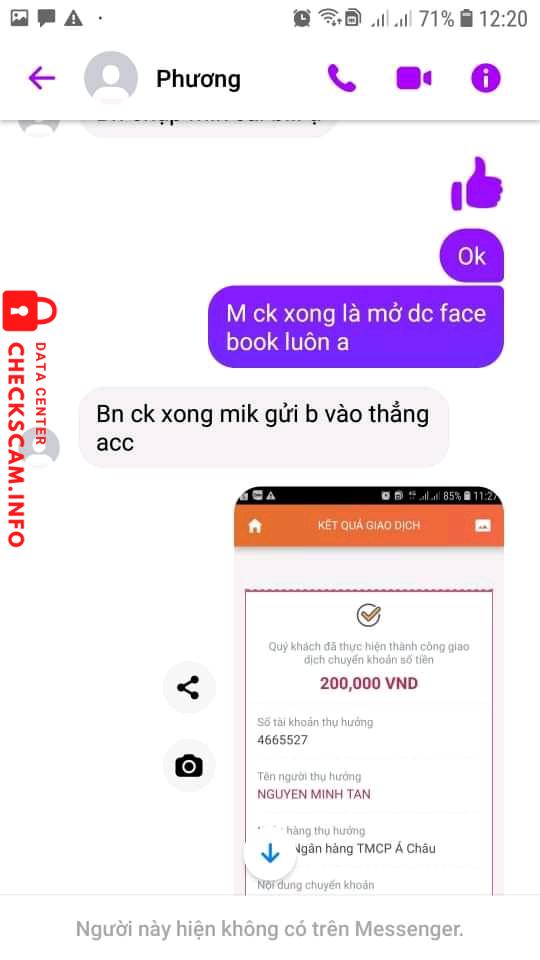Scammer Alert: Nguyễn Minh Tân Reported: November 16, 2024 Scammer Information Full Name: Nguyễn Minh Tân Payment Gate: ACB Payment Account: 4665527 Category: Marketplace scams Source: Checkscam Evidence Files Report Description Lừa đảo qua hình thức Facebook..+ mạng xã hội zalo, làm xong chặn hết tất cả Comments Your comment Add Comment No comments yet. Be the first to share your experience with this scammer.
