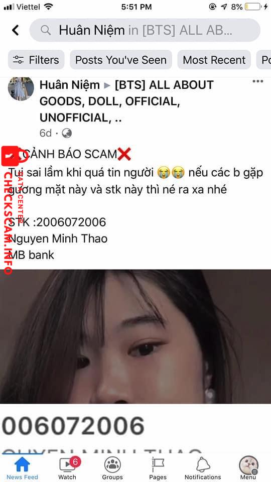 Scammer Alert: Nguyen Minh Thao Reported: November 16, 2024 Scammer Information Full Name: Nguyen Minh Thao Payment Gate: MBBank Payment Account: 2006072006 Category: Marketplace scams Source: Checkscam Evidence Files Report Description Scam nhiều người rồi Comments Your comment Add Comment No comments yet. Be the first to share your experience with this scammer.
