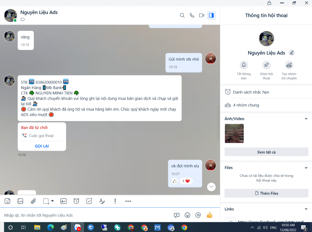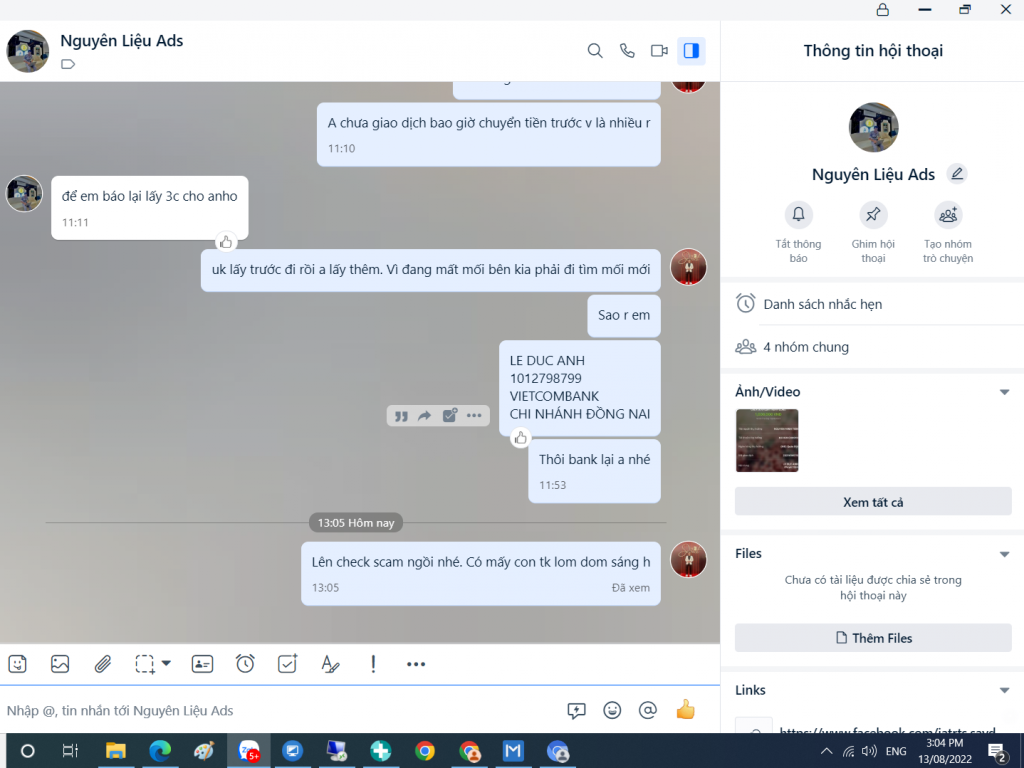 Scammer Alert: NGUYEN MINH TIEN Reported: November 16, 2024 Scammer Information Full Name: NGUYEN MINH TIEN Payment Gate: Mb Bank Payment Account: 838620000010 Category: Marketplace scams Source: Checkscam Evidence Files Report Description Lừa đảo bán nguyên liệu. Chuyển tiền xong không gửi tài khoản cũng như không hoàn trả lại Comments Your comment Add Comment No comments yet. Be the first to share your experience with this scammer.
