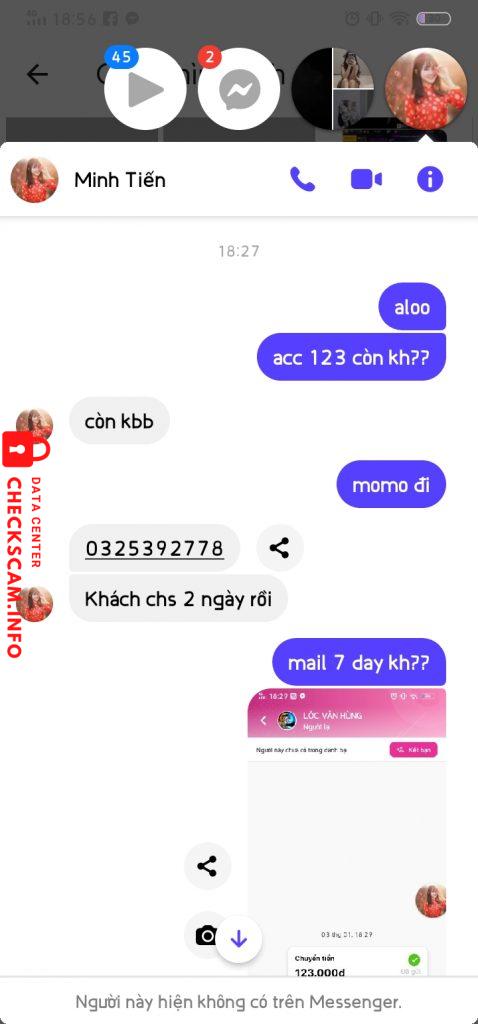 Scammer Alert: Nguyễn Minh Tiến Reported: November 16, 2024 Scammer Information Full Name: Nguyễn Minh Tiến Phone Number: 0325392778 Payment Gate: MôM Payment Account: 0325392778 Category: Marketplace scams Source: Checkscam Evidence Files Report Description Scam Comments Your comment Add Comment No comments yet. Be the first to share your experience with this scammer.