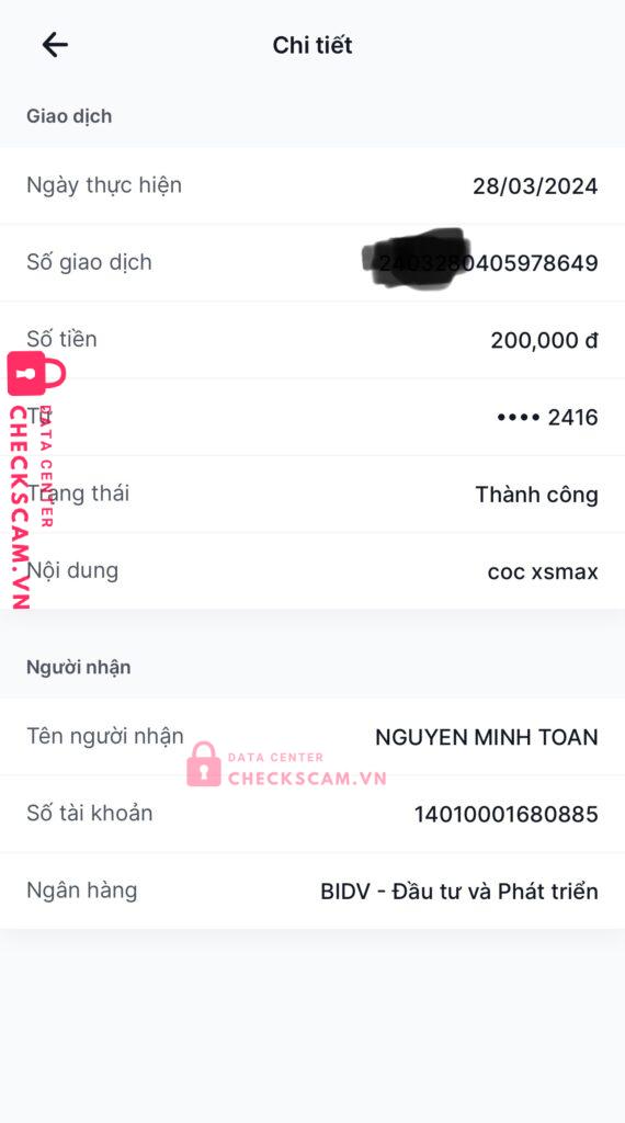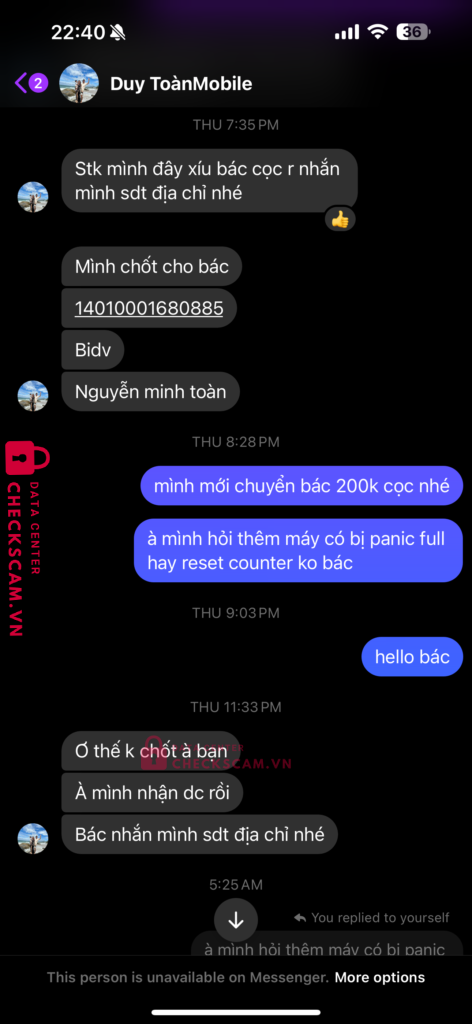 Scammer Alert: Nguyễn Minh Toàn Reported: November 16, 2024 Scammer Information Full Name: Nguyễn Minh Toàn Payment Gate: BIDV Payment Account: 14010001680885 Category: Marketplace scams Source: Checkscam Evidence Files Report Description Lừa đảo cọc iphone xsmax, sau đó block tài khoản facebook mình Comments Your comment Add Comment No comments yet. Be the first to share your experience with this scammer.