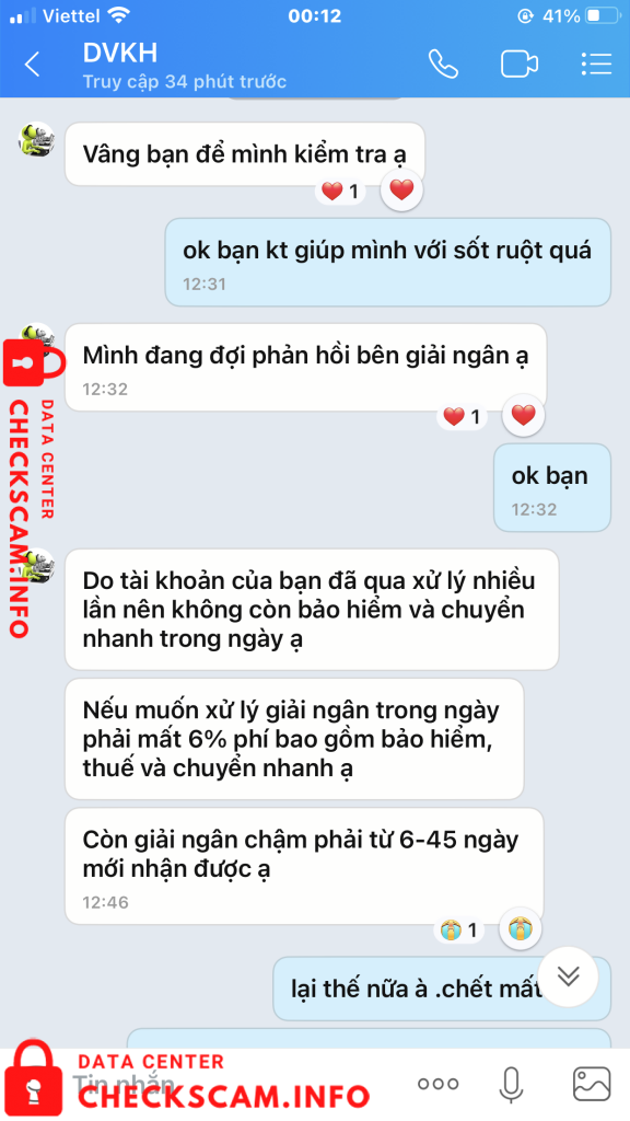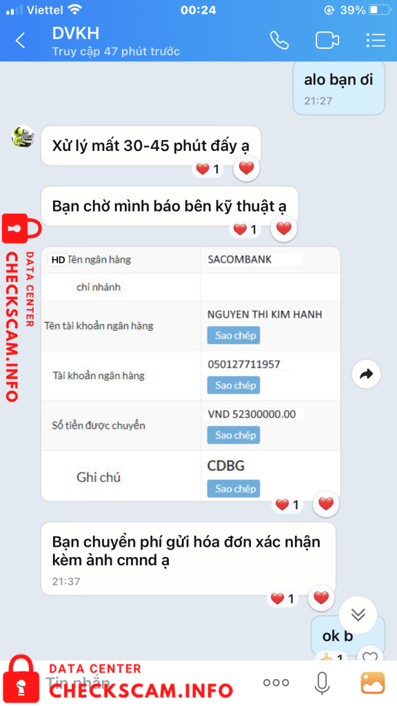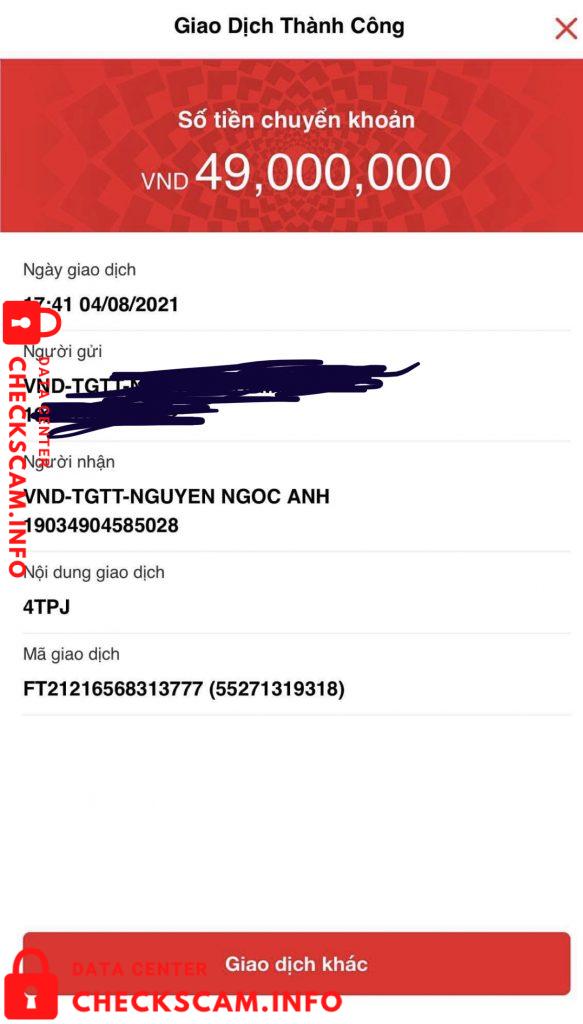 Scammer Alert: Nguyen Ngoc Anh Reported: November 16, 2024 Scammer Information Full Name: Nguyen Ngoc Anh Payment Gate: techcombank Payment Account: 19034904585028 Category: Marketplace scams Source: Checkscam Evidence Files Report Description tôi tố cáo chủ tk nguyen ngoc anh sàn giao dịch delotn đã lừa tôi không chuyển trả lại tôi số tiền tôi đầu từ cộng với lợi nhuận như đã thoả thuận . Comments Your comment Add Comment No comments yet. Be the first to share your experience with this scammer.
