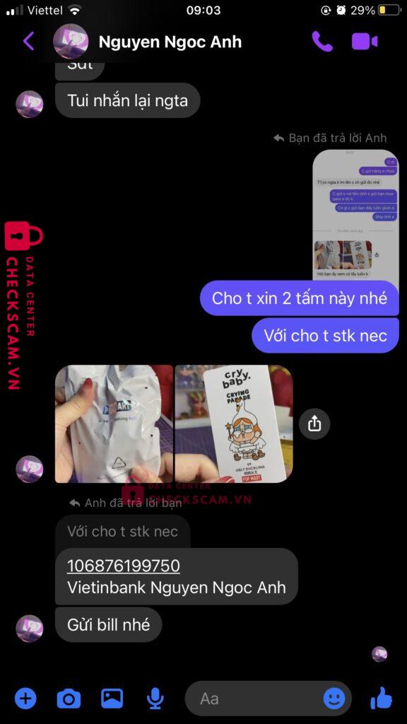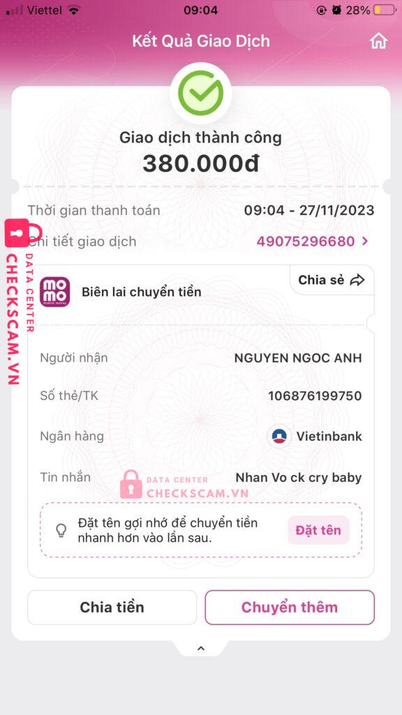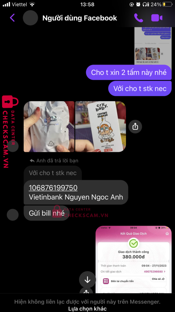 Scammer Alert: Nguyen Ngoc Anh Reported: November 16, 2024 Scammer Information Full Name: Nguyen Ngoc Anh Payment Gate: Vietinbank Payment Account: 106876199750 Category: Marketplace scams Source: Checkscam Evidence Files Report Description Lừa đảo trong gr blindbox Comments Your comment Add Comment No comments yet. Be the first to share your experience with this scammer.
