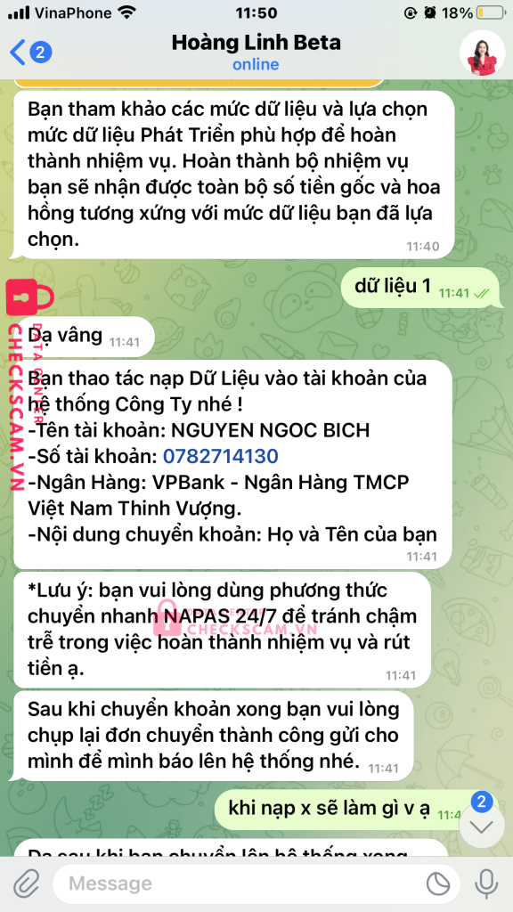 Scammer Alert: NGUYEN NGOC BICH Reported: November 16, 2024 Scammer Information Full Name: NGUYEN NGOC BICH Payment Gate: VPBank Payment Account: 0782714130 Category: Marketplace scams Source: Checkscam Evidence Files Report Description Với chiêu trò lừa đảo tinh vi, làm nhân viên xử lý vé online tại nhà, mặc dù mình chưa bị nhưng đăng để mng cảnh giác Comments Your comment Add Comment No comments yet. Be the first to share your experience with this scammer.