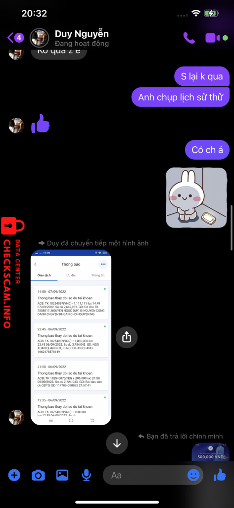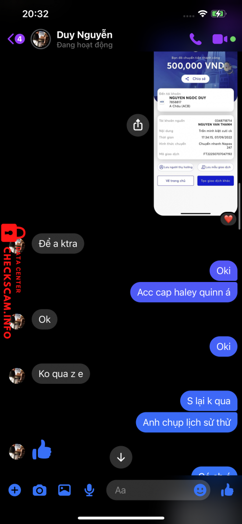 Ban đầu mua acc xin stk chuyển tự nhận là ad các kiểu xong ck kêu ko nhận được tiền có kèm bill + video lịch sử chuyển xong kêu không nhận được,nhắn tin thì coi như cho vô spam luôn lúc chuyển thì rep còn giờ onl thì chắc cho vô kho lưu trữ rồi