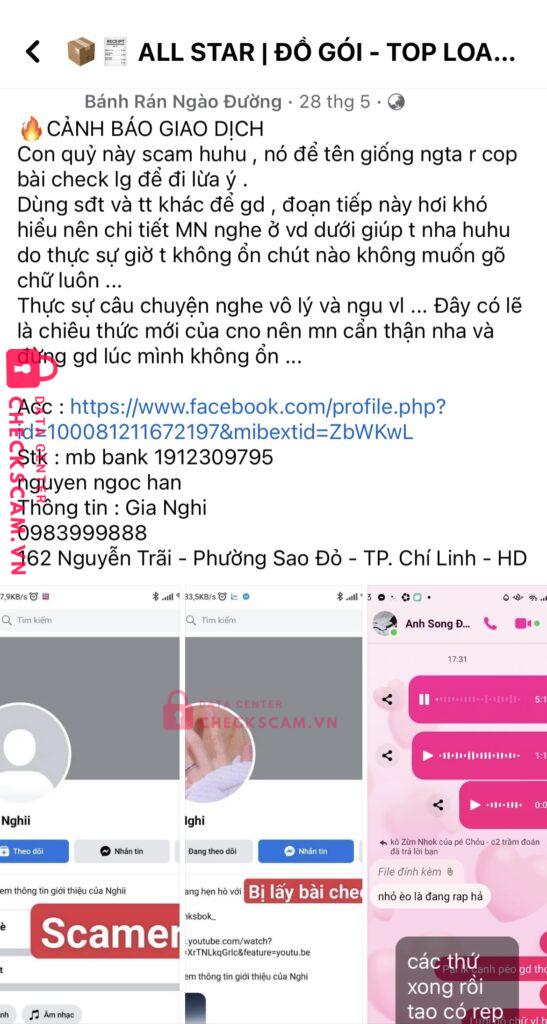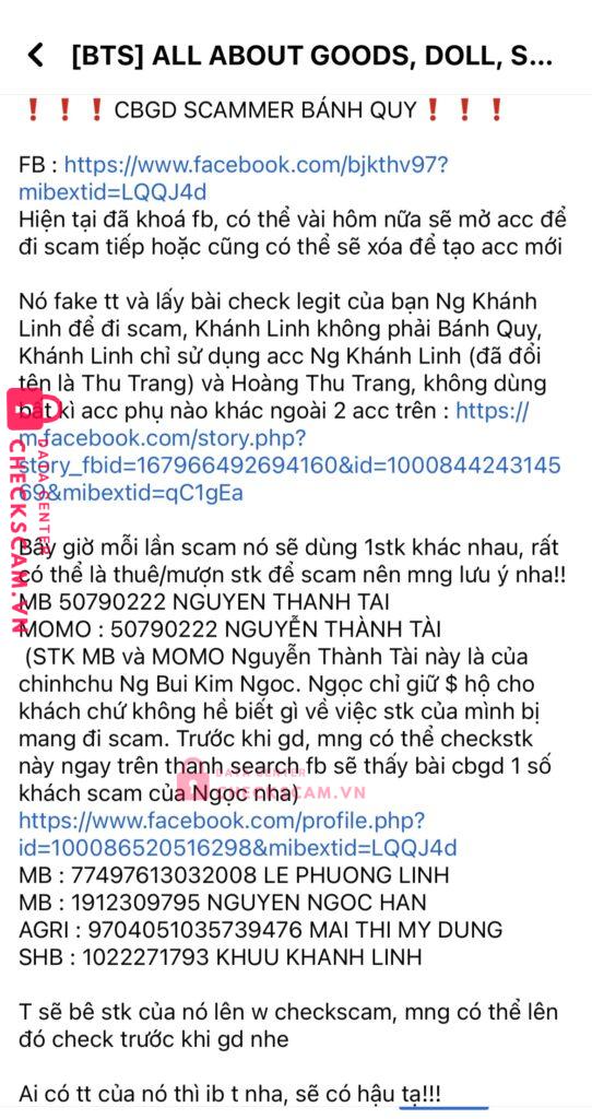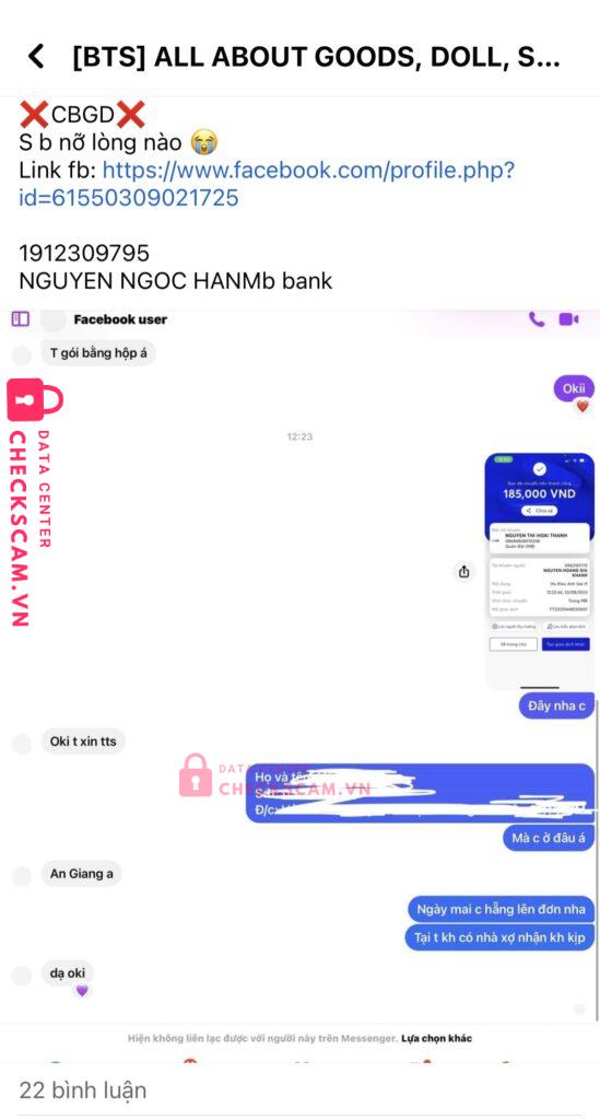 Scammer Alert: NGUYEN NGOC HAN Reported: November 16, 2024 Scammer Information Full Name: NGUYEN NGOC HAN Payment Gate: MBBank Payment Account: 1912309795 Category: Marketplace scams Source: Checkscam Evidence Files Report Description Nó sử dụng rất nhiều acc fb clone cũng như rất nhiều stk thuê khác nhau để scam ở group goods BTS và group All Star Comments Your comment Add Comment No comments yet. Be the first to share your experience with this scammer.